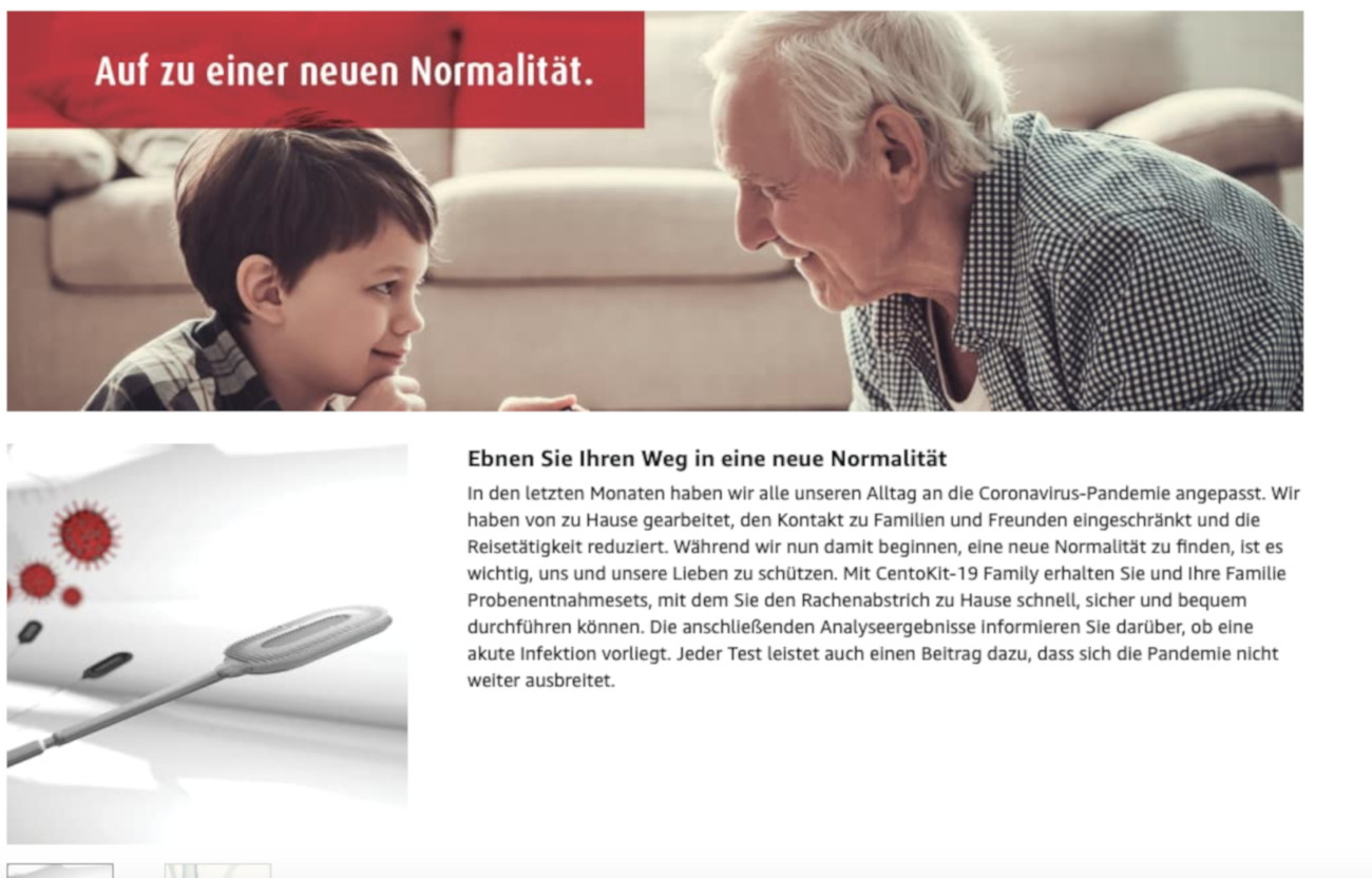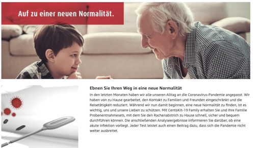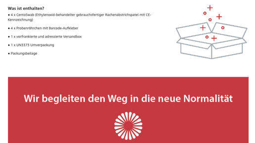Der Verkäufer lockt mit einem einfachen „4-Schritte-Prozess“: Nach einer zwingenden Online-Registrierung und der Probenentnahme wird die Abholung mit dem Logistikdienstleister „Go!“ vereinbart. Innerhalb von maximal 24 Stunden nach Probeneingang soll das Ergebnis dann im Online-Portal einsehbar sein. „Ebnen Sie Ihren Weg in eine neue Normalität“, schreibt Centogene. „Mit CentoKit-19 erhalten Sie ein Probenentnahmeset, mit dem Sie den Rachenabstrich zu Hause schnell, sicher und bequem durchführen können.“ Kinder und Jugendliche unter 18 Jahren dürfen den Test nicht alleine durchführen. Falls die Probenentnahme durch eine Zweitperson stattfindet, soll diese sich durch „adäquate Hygienemaßnahmen“ schützen.
