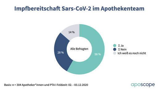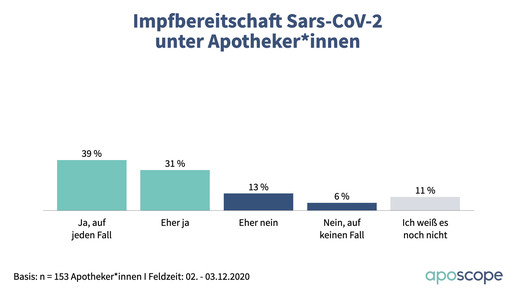 Trotzdem geben nur 26 Prozent an, sich auf jeden Fall gegen das Coronavirus impfen lassen zu wollen. Während 39 Prozent der Apotheker entschlossen sind, liegt die Quote mit 13 Prozent bei PTA deutlich niedriger. Jeweils knapp ein Drittel wäre vermutlich dabei, während 19 beziehungsweise 38 Prozent dies tendenziell oder kategorisch ausschließen. 11 Prozent der Approbierten und 17 Prozent der PTA wissen es noch nicht.
