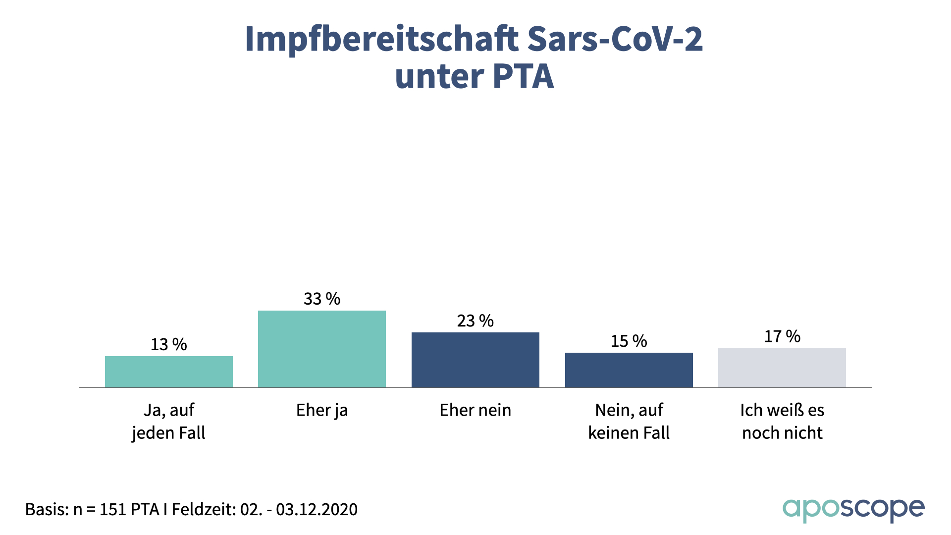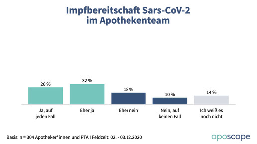 Trotzdem geben nur 26 Prozent an, sich auf jeden Fall gegen das Coronavirus impfen lassen zu wollen. Während 39 Prozent der Apotheker entschlossen sind, liegt die Quote mit 13 Prozent bei PTA deutlich niedriger. Jeweils knapp ein Drittel wäre vermutlich dabei, während 19 beziehungsweise 38 Prozent dies tendenziell oder kategorisch ausschließen. 11 Prozent der Approbierten und 17 Prozent der PTA wissen es noch nicht.