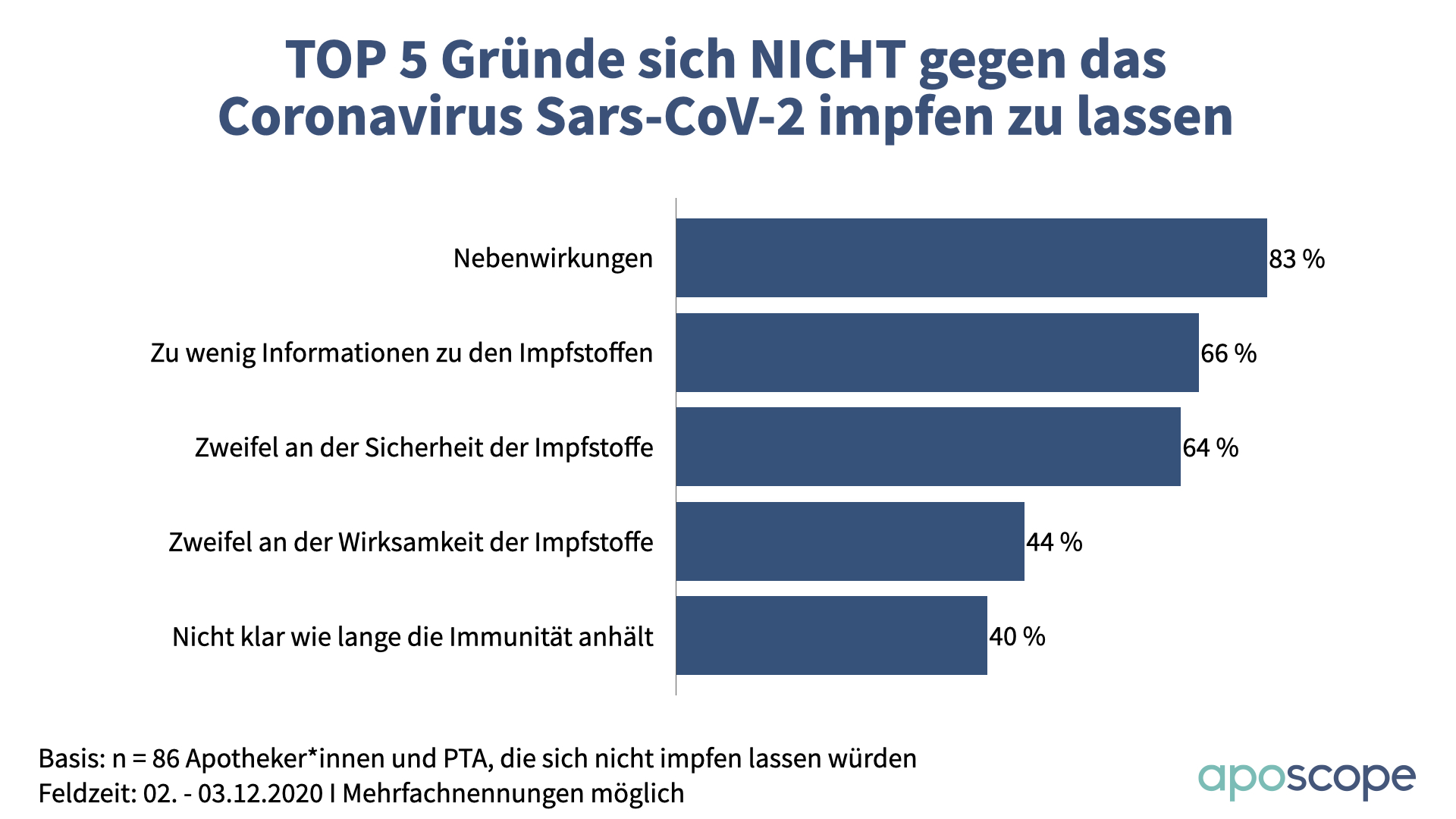 Diese Werte sind nicht neu, sondern spiegeln das Ergebnis früherer aposcope-Umfragen seit dem Sommer wider. Was aber sind die Gründe für die Skepsis? Nebenwirkungen werden von 83 Prozent genannt, zu wenig Informationen zu den Impfstoffen von zwei Dritteln. 64 Prozent zweifeln an der Sicherheit der Impfstoffe, 44 Prozent an der Wirksamkeit. Für 40 Prozent ist unklar, wie lange die Immunität anhält. 31 Prozent wollen Risikogruppen den Vortritt lassen. Außerdem gibt es Kollegen, der zu erwartende Andrang bei den Impfzentren abschreckt und die sich erst in der zweiten Phase in der Arztpraxis impfen lassen wollen.