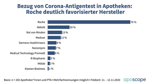 Die meisten Apotheken haben sich für einen (52 Prozent) oder zwei bis drei Tests (44 Prozent) entschieden. Die Nase vorne hat mit Abstand der Sars-CoV-2 Rapid Antigen Test von Roche, den drei von vier Apotheken bereits bezogen haben. Dahinter folgen die Tests von Abbott (20 Prozent), Nal von Minden (13 Prozent) und Medsan (12 Prozent). Wichtigste Kriterien sind neben Sensitivität und Spezifität (je 96 Prozent) für knapp drei von vier Apothekern der Stücknutzen beziehungsweise die Marge sowie der Preis für den Endkunden (62 Prozent).