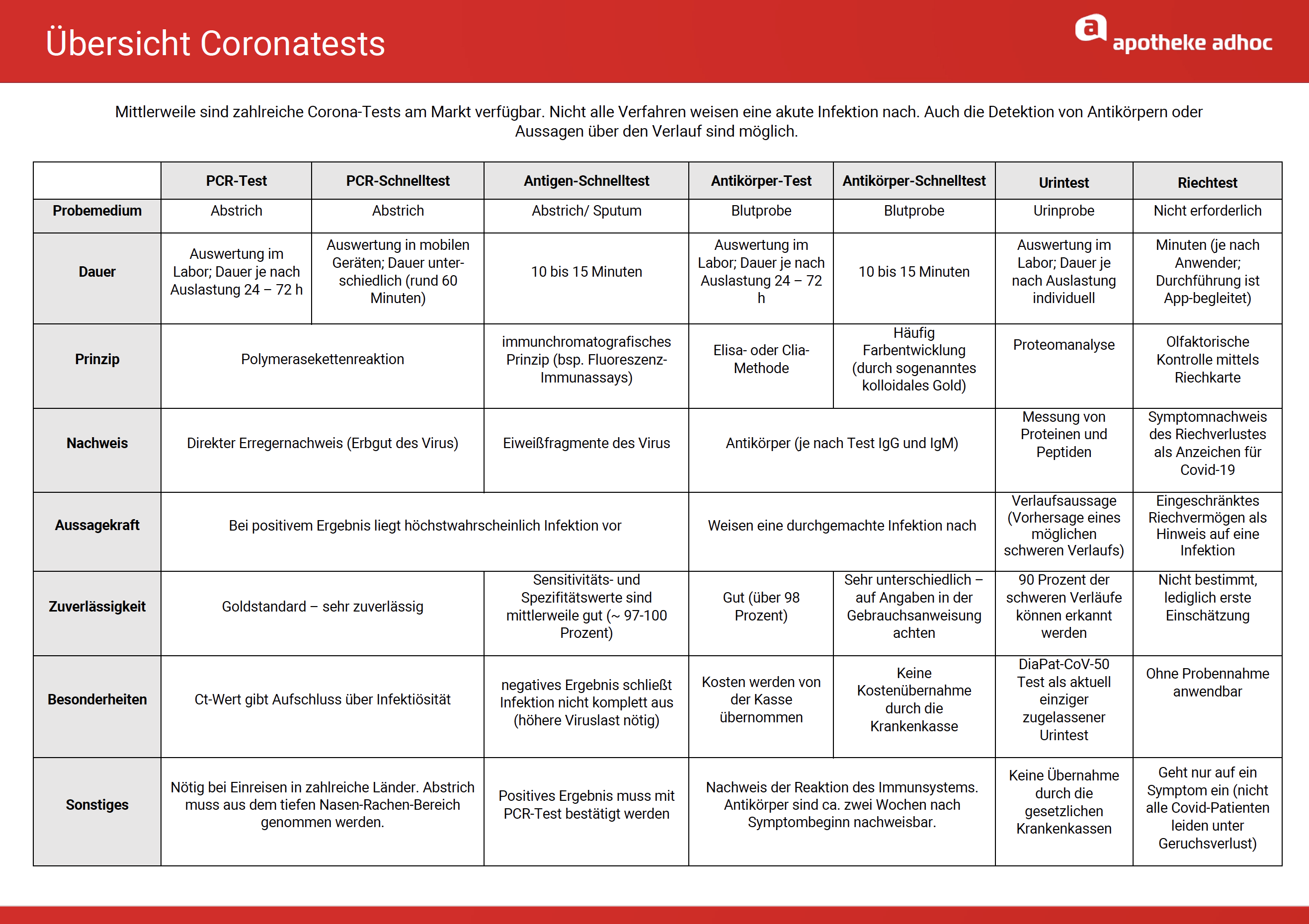 Einige Exoten, wie der Corona-Riechtest, können nur bedingt zur Testung empfohlen werden. Der Riechtest detektiert lediglich ein verschlechtertes Riechvermögen. Viele Covid-Patienten berichten über einen temporären Verlust des Riech- und Geschmacksinns. Andere Tests, wie der Urintest, dienen nur der Verlaufsprognose. Sie werden nur bei bereits positiv getesteten Personen in Praxen und Kliniken eingesetzt.