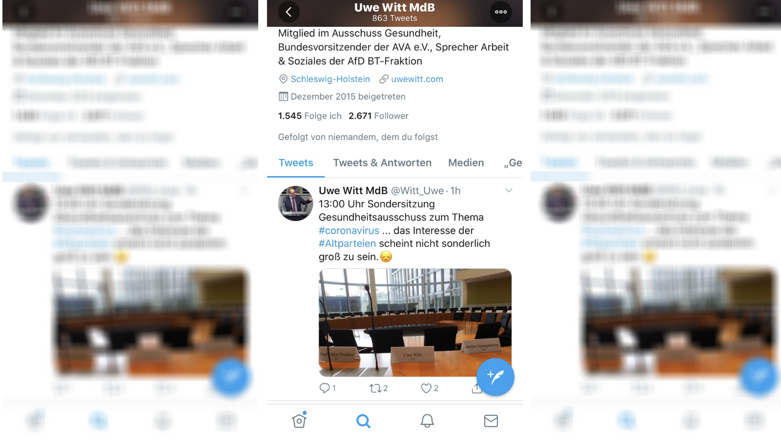 Allerdings twitterte der AfD-Abgeordnete Uwe Witt bereits um 13 Uhr ein Foto mit Blick auf seinen Sitzplatz im Ausschuss und leeren Reihen mit der Bemerkung: „#coronavirus … das Interesse der #Altparteien scheint nicht sonderlich groß zu sein“ – versehen mit einem traurig blickenden Emoji. Es dauerte 50 Minuten, bis die Fake-News in der laufenden Ausschuss-Sitzung die Runde machte. Ein Ausschuss-Mitarbeiter informierte den Vorsitzenden Erwin Rüddel (CDU). Daraufhin bat Rüddel – zunächst ohne Namensnennung des AfD-Abgeordneten – Tweets aus der laufenden Sitzung zu unterlassen.