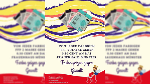 In Münster und Erftstadt hat man sich unabhängig von Coupons eine Spendenaktion einfallen lassen. Im Fokus stehen dabei bunte FFP2-Masken: Unter dem Motto „Wir zeigen Farbe gegen Gewalt“ werden für jede verkaufte Maske 50 Cent an das örtliche Frauenhaus gespendet. „Ich habe mich extra dafür entschieden die Aktion unabhängig von den Berechtigungsscheinen durchzuführen“, erklärt Apothekerin Sylke Bergmann von der Margareten Apotheke in Münster. „Denn viele nehmen wegen der Aktion noch eine zusätzliche Maske mit, um die Spende zu unterstützen.“ Außerdem gebe es schließlich auch noch solche, die keine Coupons bekommen – „auch die sollen die Möglichkeit haben etwas Gutes tun zu können“, findet Bergmann.