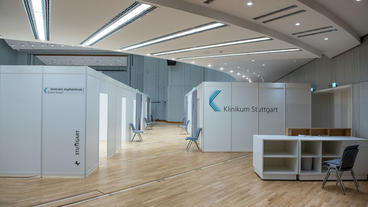 Anders als die 50 Kreisimpfzentren (KIZ) in Baden-Württtemberg werden die ZIZ von den Kliniken aufgebaut. Neun gibt es davon in Baden-Württemberg, die Liederhalle ist einer von zwei solchen Standorten in Stuttgart. Wo normalerweise Bälle, Konzerte, Hochzeitsmessen und Kongresse stattfinden, führt ein System aus leuchtend roten Absperrbändern den Besucher in den Saal im Bauch des Gebäudes. Über Fernseher in der Lobby des Saales flackern in Endlosschleife erklärende Filme, Wartestühle stehen dort, wo normalerweise Garderobe und Bar geöffnet sind. In Kabinen können Besucher mit einem Impftermin noch den Rat eines Mediziners einholen, bevor sie über ein Barcode-System in den Saal mit den Impfräumen geleitet werden. Dort formen jetzt schneeweiße Trennwände mehr als ein Dutzend Kabinen und zwei Straßen. Einsam stehen Stühle vor jeder Kabine.