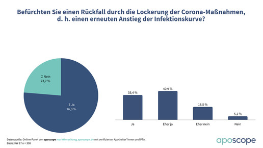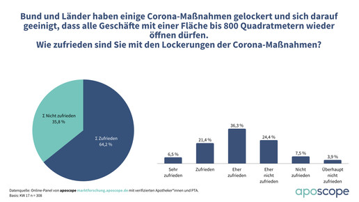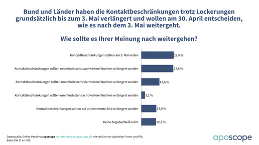 Bund und Länder haben einige Corona-Maßnahmen gelockert und sich darauf geeinigt, dass Geschäfte mit einer Fläche bis 800 Quadratmetern wieder öffnen dürfen. Die meisten Apotheker und PTA sind damit zufrieden (64 Prozent Zustimmung). Gleichzeitig befürchtet aber eine Mehrheit von 76 Prozent, dass eine Lockerung der Corona-Maßnahmen zu einem erneuten Anstieg der Infektionskurve führen wird. Vielleicht auch deshalb sprechen sich 59 Prozent dafür aus, dass die Kontaktbeschränkungen trotz der erfolgten Lockerungen auch über den 3. Mai hinaus verlängert werden sollen. 28 Prozent sprechen sich dafür aus, dass die Beschränkung zum Stichtag aufgehoben werden.