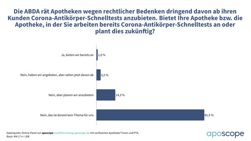 Auch wenn bislang nur vereinzelt Apotheken die Schnelltests tatsächlich schon anbieten (1 Prozent), planen 14,3 Prozent ein solches Angebot. Zum Zeitpunkt der Befragung war die Einschätzung der Abda allerdings auch noch relativ frisch – hat im Vergleich zur Befragung in der Vorwoche aber schon gewirkt, als noch 25 Prozent angaben, Schnelltests anbieten zu wollen. Und von den insgesamt wenigen Apotheken, die schon Schnelltests angeboten haben, ist ein Teil nach den jüngsten Entwicklungen schon wieder davon abgerückt (3,2 Prozent). Für die meisten Apotheken (82 Prozent) sind Schnelltests aktuell kein Thema (Vorwoche: 72 Prozent).
