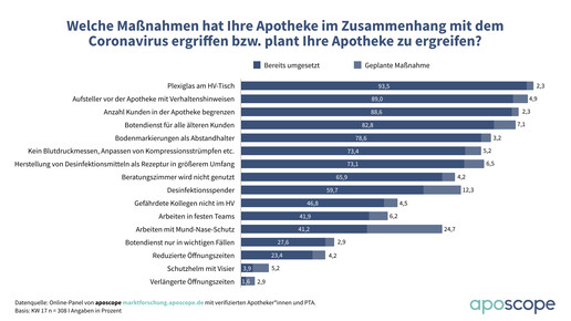 Doch auch für besonders gefährdete Kunden haben viele Apotheken eigens Maßnahmen ergriffen. So gaben 83 Prozent an, älteren Kunden derzeit mit dem Botendienst zu Hause zu beliefern, damit sie nicht in die Apotheke kommen müssen. Ein Umstand, dem die Regierung jetzt Rechnung trägt. Bundesgesundheitsminister Jens Spahn (CDU) hat per Verordnung eine gesonderte Vergütung für den Botendienst eingeführt und sich mit einem Brief bei den Apotheken bedankt.