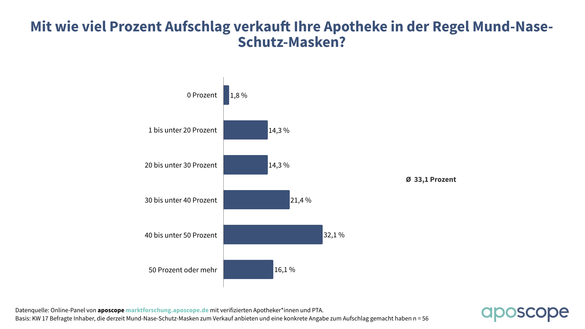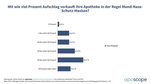 Bei der Preisgestaltung gehen die Inhaber unterschiedliche Wege: Jede sechste Apotheke begnügt sich mit einem Aufschlag von bis zu 20 Prozent. 1,8 Prozent gaben sogar an, die Masken zum Einkaufspreis an die Kunden abzugeben. Auf der anderen Seite veranschlagt wiederum jeder sechste Apothekenleiter Aufschläge von 50 Prozent und mehr auf die derzeit so gefragte Ware. Der Großteil bewegt sich zwischen diesen Rändern: 20 bis unter 30 Prozent Aufschlag (14,3 Prozent), 30 bis unter 40 Prozent (21 Prozent) und 40 bis unter 50 Prozent (32 Prozent). Der Mittelwert beim Aufschlag beträgt 33,1 Prozent.