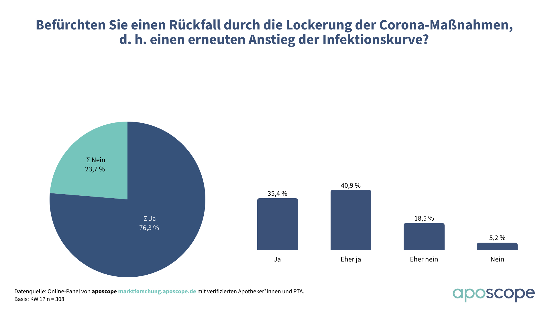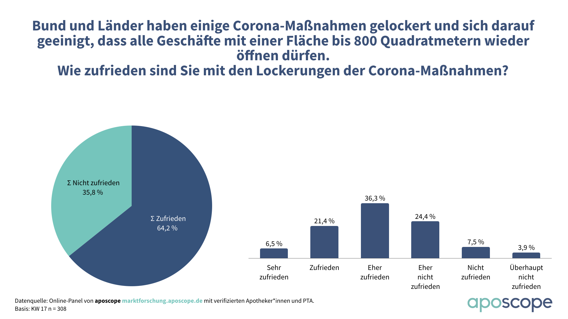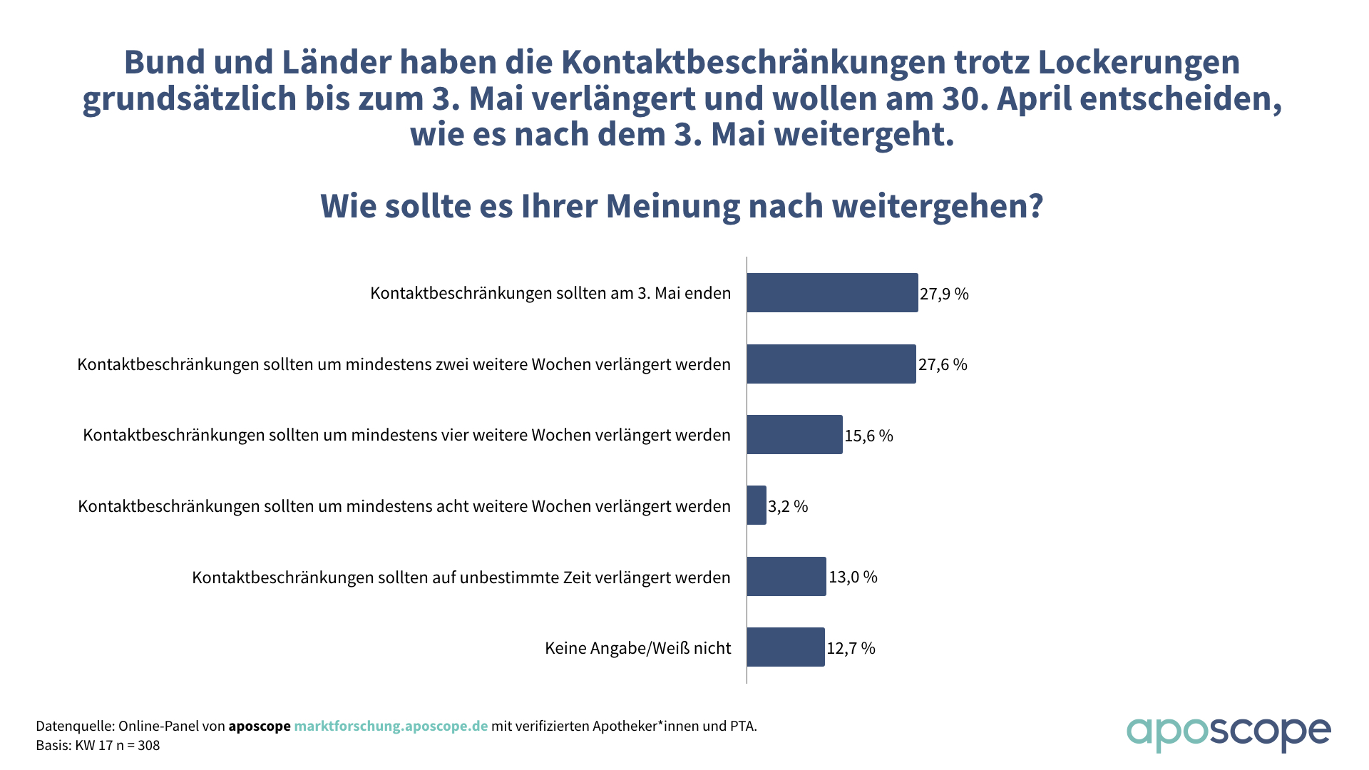 Bund und Länder haben einige Corona-Maßnahmen gelockert und sich darauf geeinigt, dass Geschäfte mit einer Fläche bis 800 Quadratmetern wieder öffnen dürfen. Die meisten Apotheker und PTA sind damit zufrieden (64 Prozent Zustimmung). Gleichzeitig befürchtet aber eine Mehrheit von 76 Prozent, dass eine Lockerung der Corona-Maßnahmen zu einem erneuten Anstieg der Infektionskurve führen wird. Vielleicht auch deshalb sprechen sich 59 Prozent dafür aus, dass die Kontaktbeschränkungen trotz der erfolgten Lockerungen auch über den 3. Mai hinaus verlängert werden sollen. 28 Prozent sprechen sich dafür aus, dass die Beschränkung zum Stichtag aufgehoben werden.