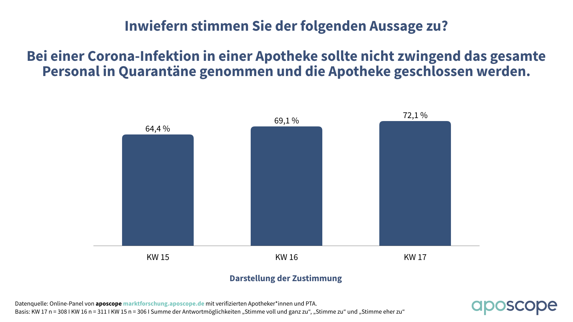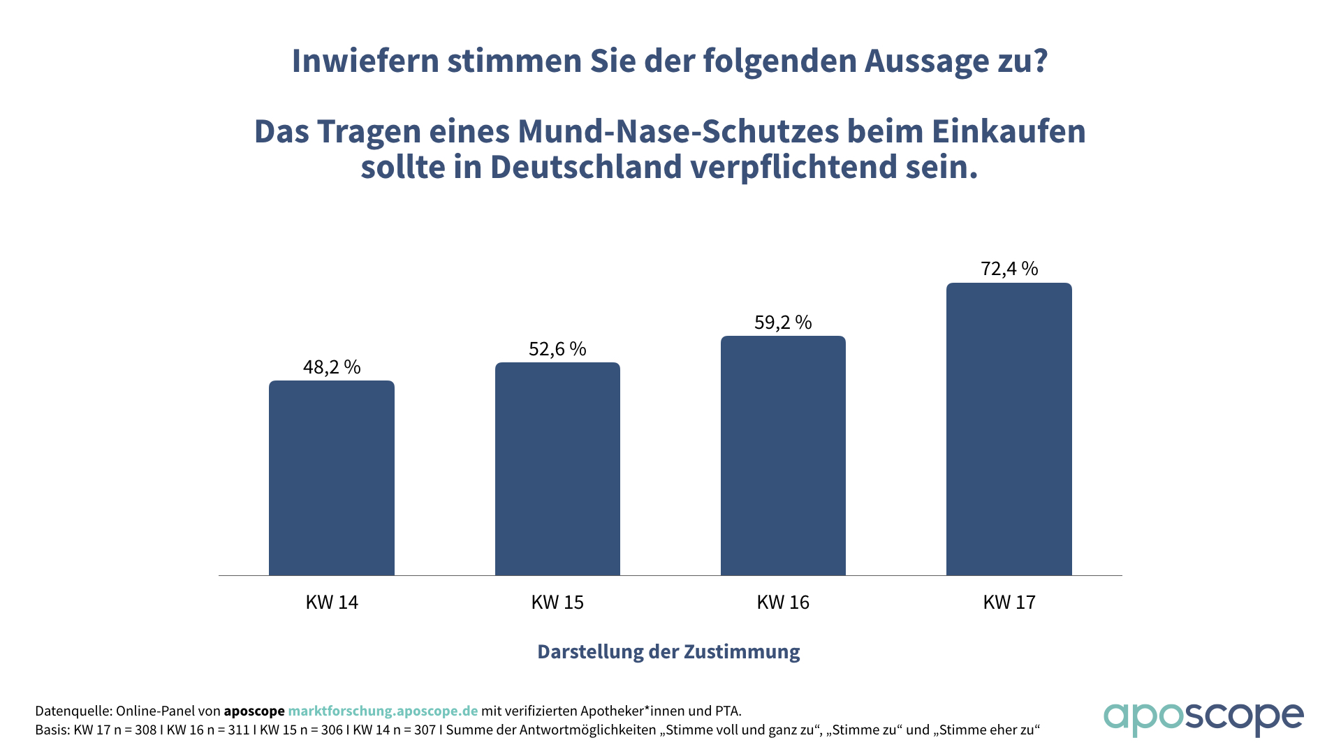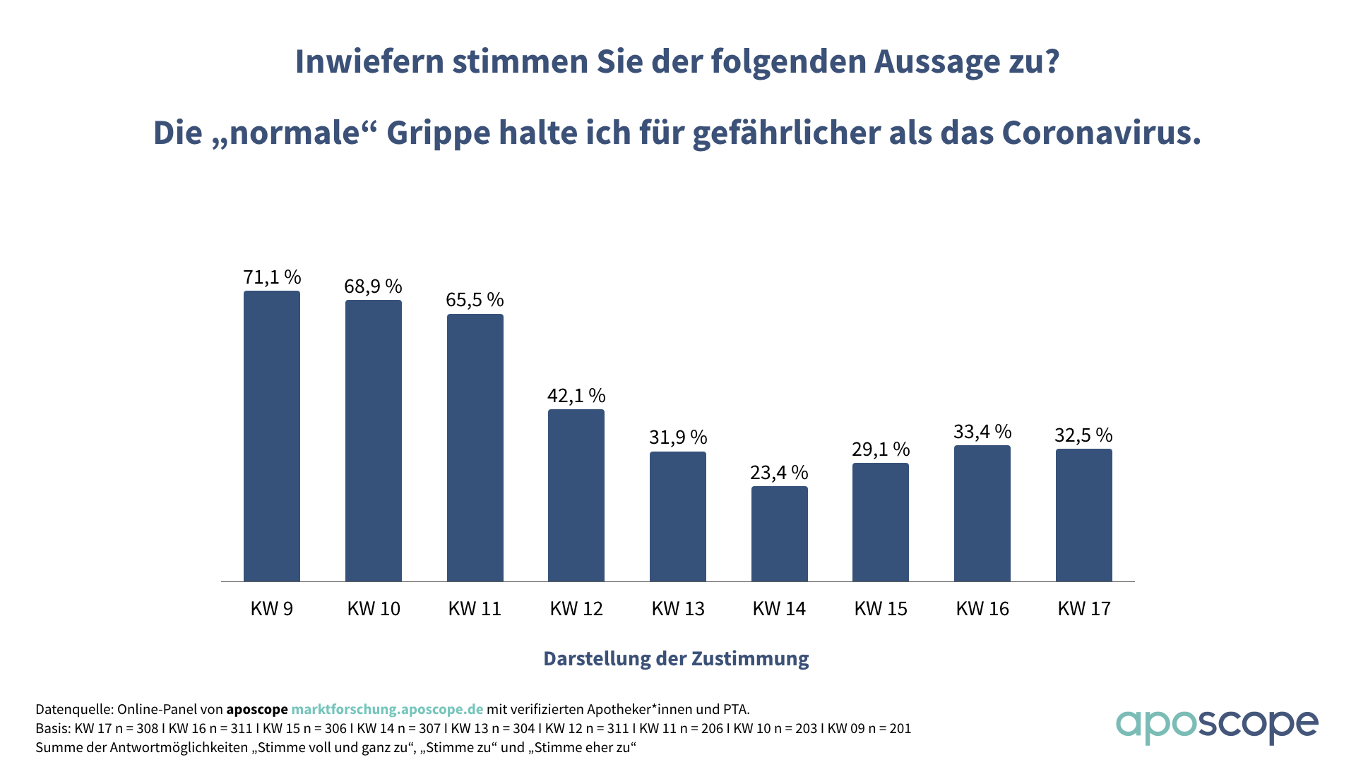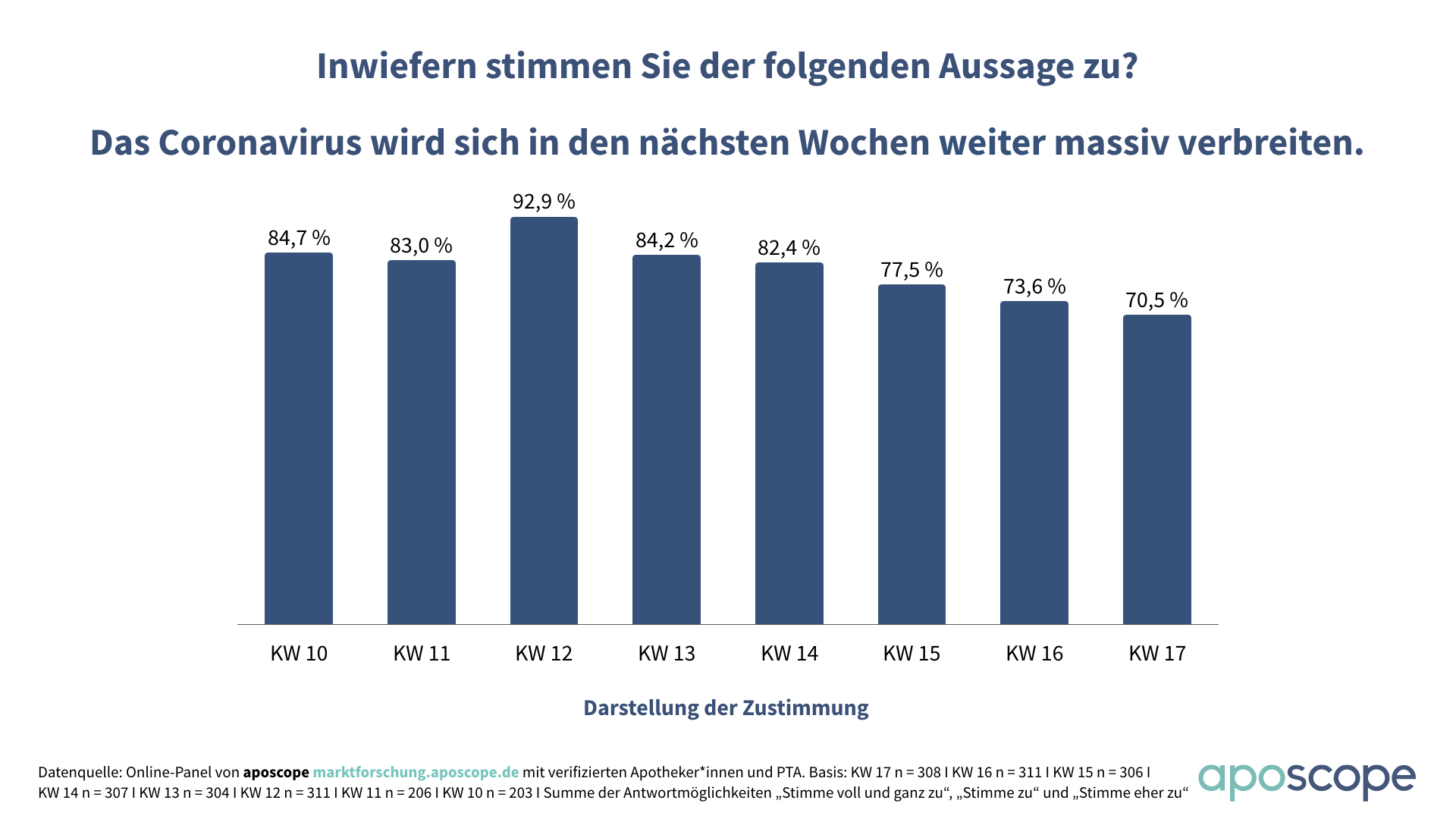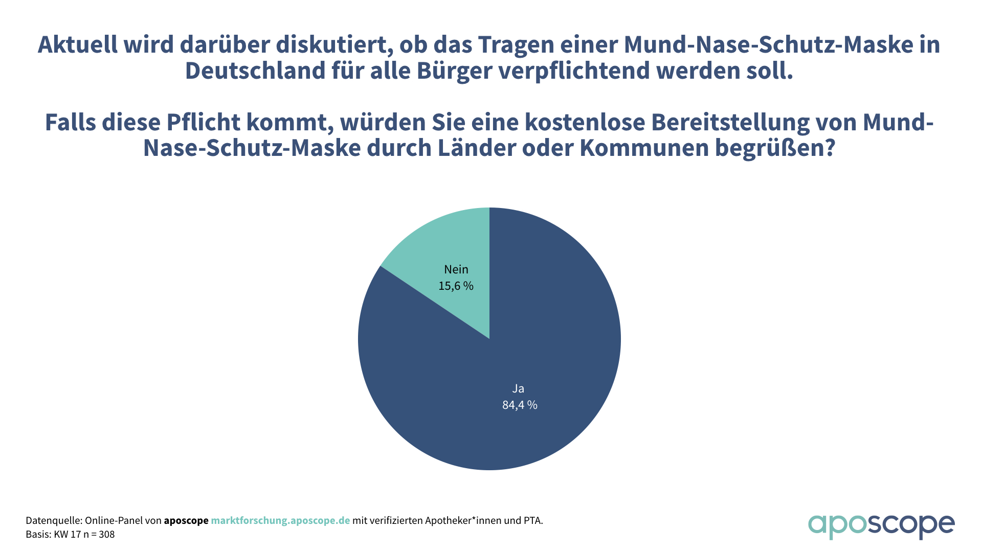aposcope befragt seit dem 25. Februar 2020 jede Woche verifizierte Apotheker und PTA online zum Thema Coronavirus. An der aktuellen Umfrage zur „Zahl der Woche“ nahmen am 21. April 2020 insgesamt 308 Apotheker und PTA teil. Die Umfrage ist repräsentativ für die deutsche Apothekenlandschaft.