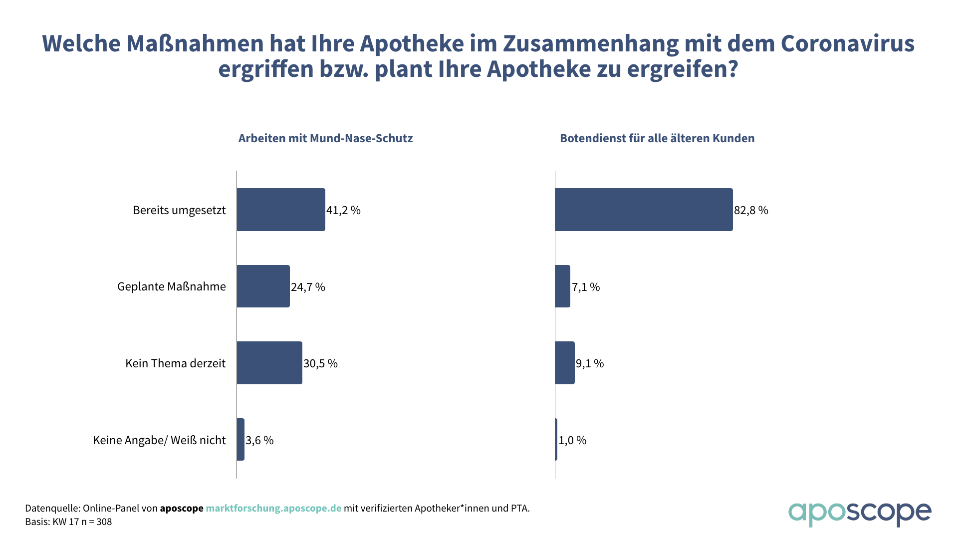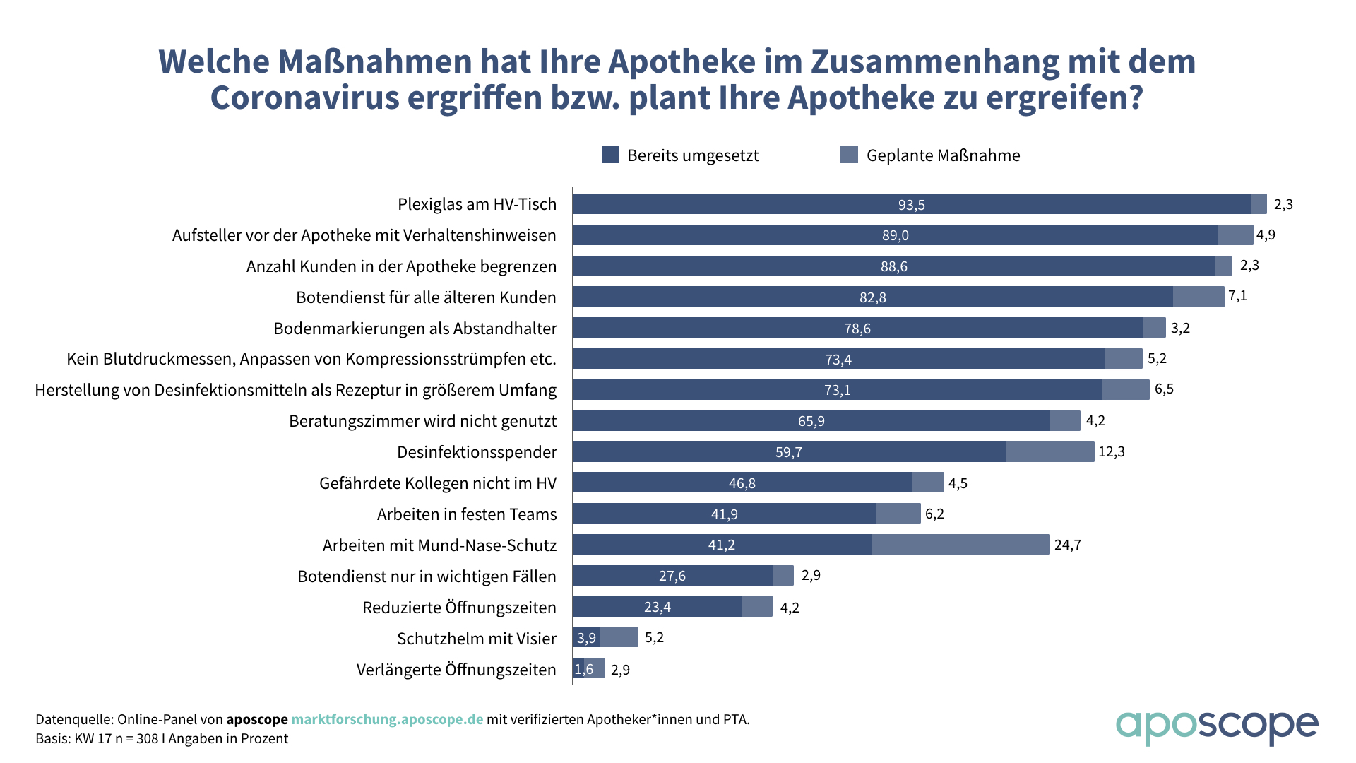 Doch auch für besonders gefährdete Kunden haben viele Apotheken eigens Maßnahmen ergriffen. So gaben 83 Prozent an, älteren Kunden derzeit mit dem Botendienst zu Hause zu beliefern, damit sie nicht in die Apotheke kommen müssen. Ein Umstand, dem die Regierung jetzt Rechnung trägt. Bundesgesundheitsminister Jens Spahn (CDU) hat per Verordnung eine gesonderte Vergütung für den Botendienst eingeführt und sich mit einem Brief bei den Apotheken bedankt.