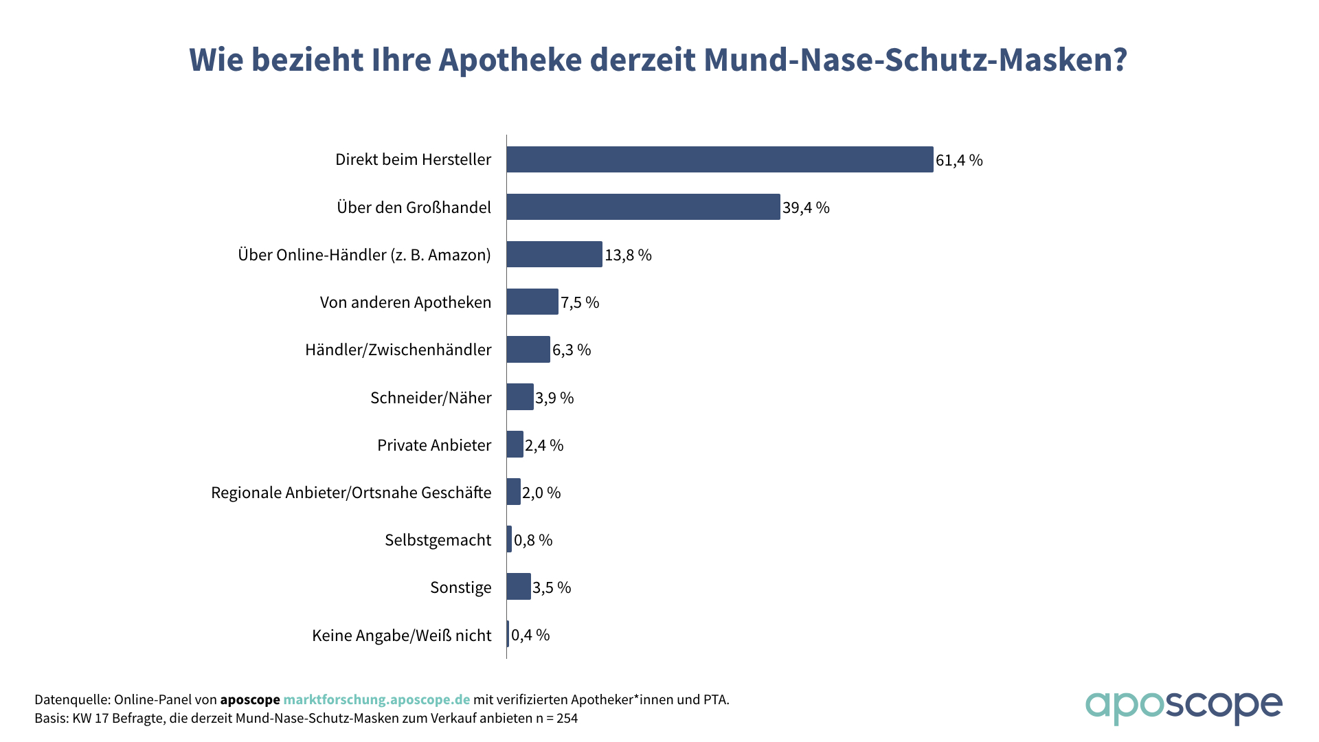 Die Marge liegt bekanntlich ohnehin im Einkauf. Wer gute Bezugsquellen hat, kann einen guten Schnitt machen, ohne die Kunden mit hohen Preisen zu überfordern oder zu verärgern. Die meisten Apotheken beziehen die Masken direkt beim Hersteller (61 Prozent), auch der Bezug über den Großhandel ist gängig (39 Prozent). 13,8 Prozent kaufen bei Online-Händlern wie Amazon. Nur etwa halb so viele (7,5 Prozent) gaben an, Masken bei Kollegen zu beziehen.