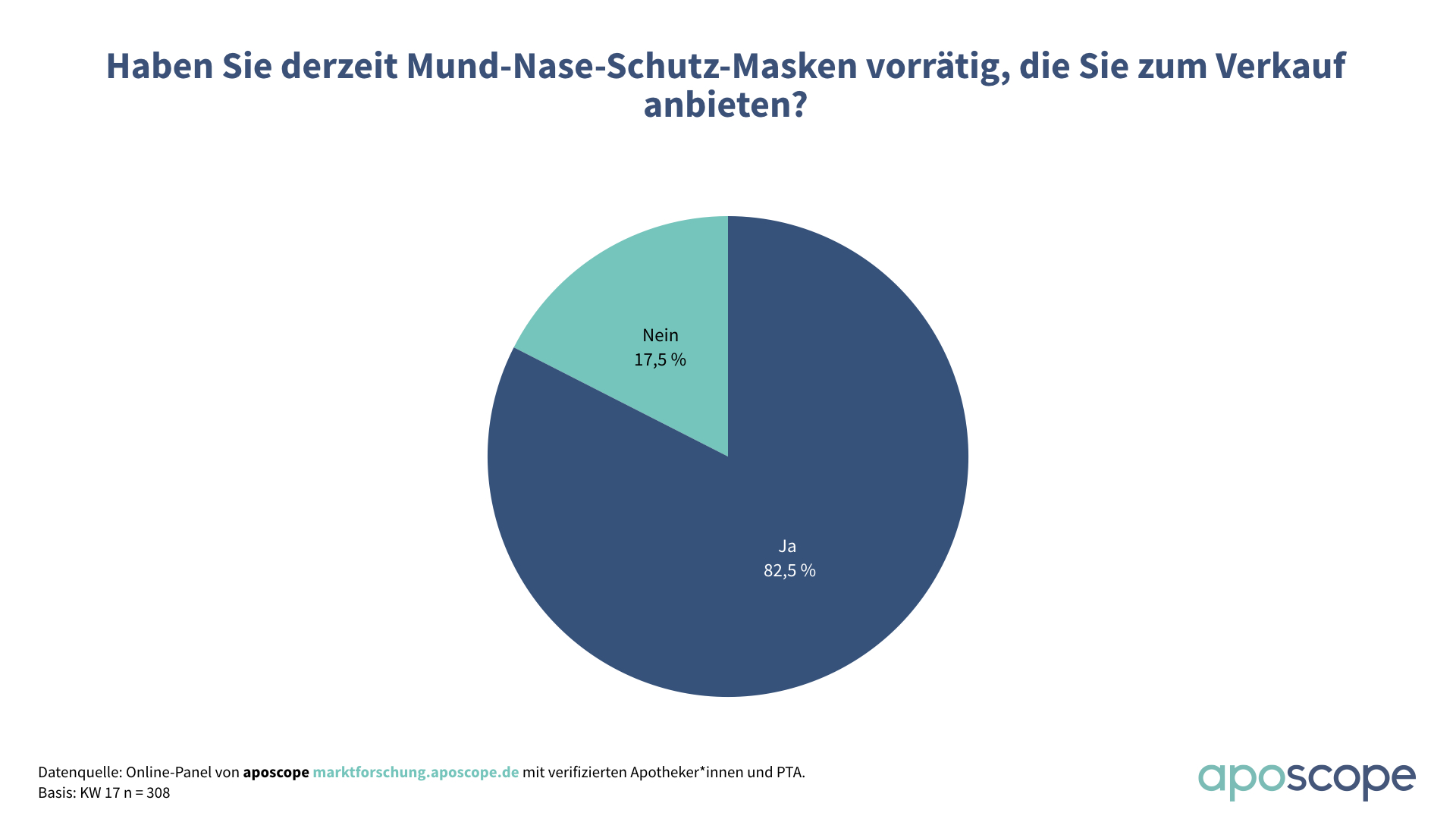 Die gute Nachricht: Die Mehrheit der Apotheken (83 Prozent) verfügt derzeit über Mund-Nase-Schutz-Masken, der Rest kann die Schutzausrüstung derzeit nicht anbieten. Häufig machen die Apotheken ihre Kunden schon mit Schildern vor der Tür darauf aufmerksam, ob sich eine Nachfrage drinnen lohnt.