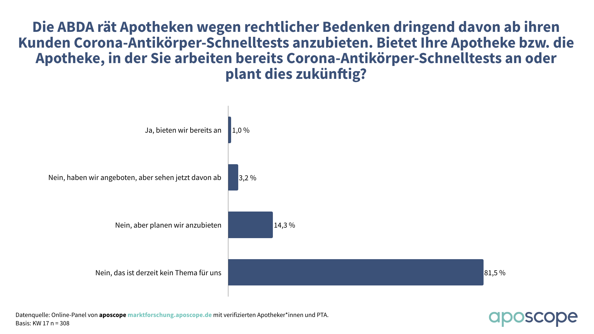 Auch wenn bislang nur vereinzelt Apotheken die Schnelltests tatsächlich schon anbieten (1 Prozent), planen 14,3 Prozent ein solches Angebot. Zum Zeitpunkt der Befragung war die Einschätzung der Abda allerdings auch noch relativ frisch – hat im Vergleich zur Befragung in der Vorwoche aber schon gewirkt, als noch 25 Prozent angaben, Schnelltests anbieten zu wollen. Und von den insgesamt wenigen Apotheken, die schon Schnelltests angeboten haben, ist ein Teil nach den jüngsten Entwicklungen schon wieder davon abgerückt (3,2 Prozent). Für die meisten Apotheken (82 Prozent) sind Schnelltests aktuell kein Thema (Vorwoche: 72 Prozent).