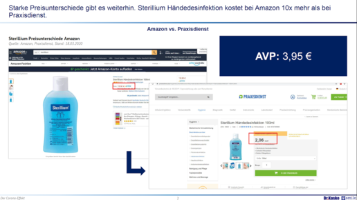 Am drastischsten waren die Preissprünge demnach bei Amazon. Sterillium kostete mit knapp 20 Euro fast das Zehnfache dessen, was Ärzte beim Anbieter Praxisdienst zahlen. Trotzdem war das Angebot nach zwei Tagen ausverkauft.