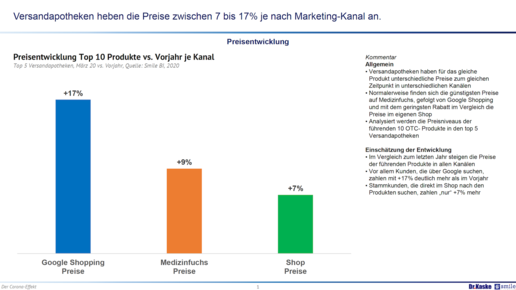 Normalerweise finden sich laut Dr. Kaske die günstigsten Preise auf Medizinfuchs, gefolgt von Google Shopping. Den geringsten Rabatt gibt es im eigenen Webshop. Analysiert wurden laut Dr. Kaske die Preisniveaus der führenden zehn OTC-Produkte in den Top-5-Versandapotheken.