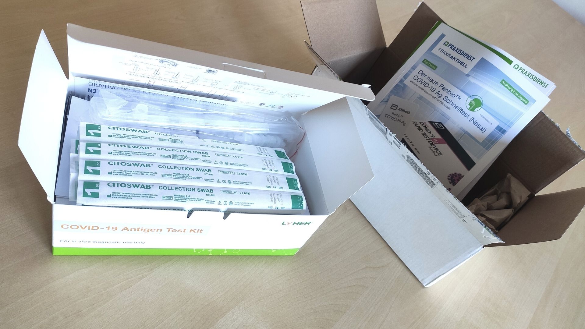 Plattformen wie Praxisdienst versenden nach kurzer Abfrage des Berufsfeldes. Weitere Details wie die eigene Umsatzsteuernummer müssen nicht zwingend angegeben werden. Bei diesem Händler kann auch der mittlerweile für den Laien zugelassene Lyher Antigen-Schnelltest von Lissner Qi bestellt werden. Das Problem: Die Auslieferung erfolgt ohne Gebrauchsanweisung für den Laien. Einige der nun per Sonderzulassung freigegebenen Endverbraucher-Tests werden laut Herstellern doppelt am Markt verfügbar sein. Je nachdem, wer der Kunde ist, muss deutlich ersichtlich sein, welcher Test abgegeben werden darf. Im vorliegenden Fall wurde einem Laien eine Verkaufseinheit für den professionellen Gebrauch zugesendet.