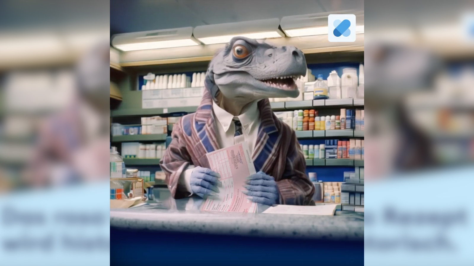 Mit dem 13-sekündigen Video soll für das E-Rezept geworben werden. Zu sehen ist ein Dinosaurier mit weißem Hemd, Schlips und Sakko, der hinter dem HV-Tisch und vor einer imaginären Sichtwahl steht und ein Papierrezept in den Händen hält.
