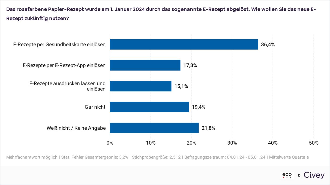 54 Prozent der Deutschen geben demnach an, das E-Rezept online einsetzen zu wollen. Eco hatte die Umfrage über das Meinungsforschungsinstituts Civey in Auftrag gegeben. Am 4. und 5. Januar gaben mehr als 2500 Teilnehmende ihre Meinung ab. Hierbei verwirrt die Wortwahl des Verbandes aber, so ging es darum das E-Rezept digital nutzen zu wollen.