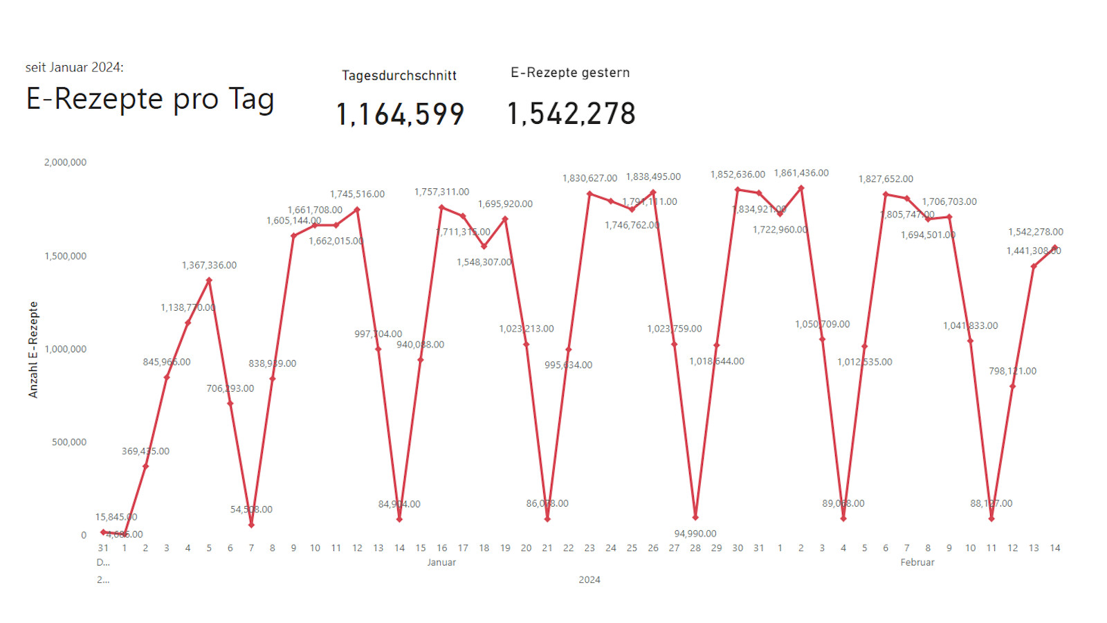 Nach einem steilen Anstieg in der ersten Woche hat sich die Anzahl an erfassten E-Rezepten eigentlich mit der Zeit leicht gesteigert. Im Durchschnitt wurden seit dem 8. Januar bis letzten Sonntag rund 1,3 Millionen Rezepte pro Tag erfasst. Diese Woche holpert das E-Rezept allerdings – und das an jedem einzelnen Tag. Am Montag waren es knapp 215.000 weniger als in der Vorwoche, am Dienstag sogar fast 390.000 weniger und gestern mehr als 260.000 weniger.