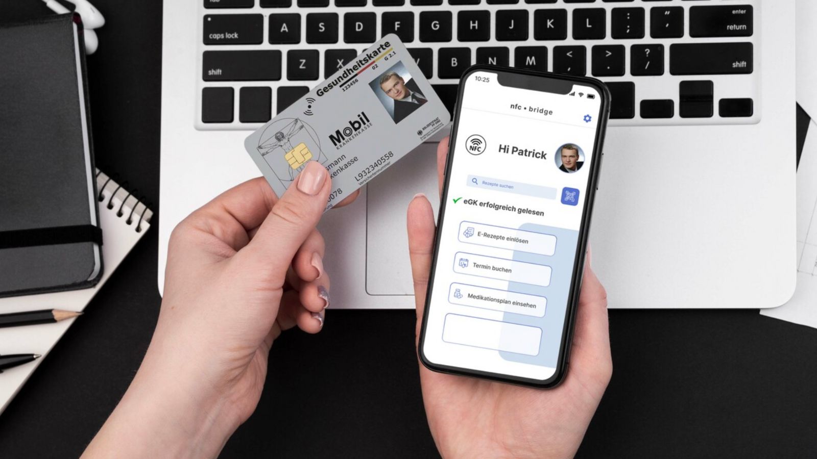Über verschiedene Anwendungen (Apps) von Apotheken, Versandapotheken oder anderen Marktteilnehmern und Plattformen können Kund:innen so mit der eGK ihre E-Rezepte einlösen, ohne dass sie eine PIN benötigen. Notwendig sind hingegen ein NFC-fähiges Smartphone und eine NFC-fähige eGK, beides ist aber in der Regel vorhanden.