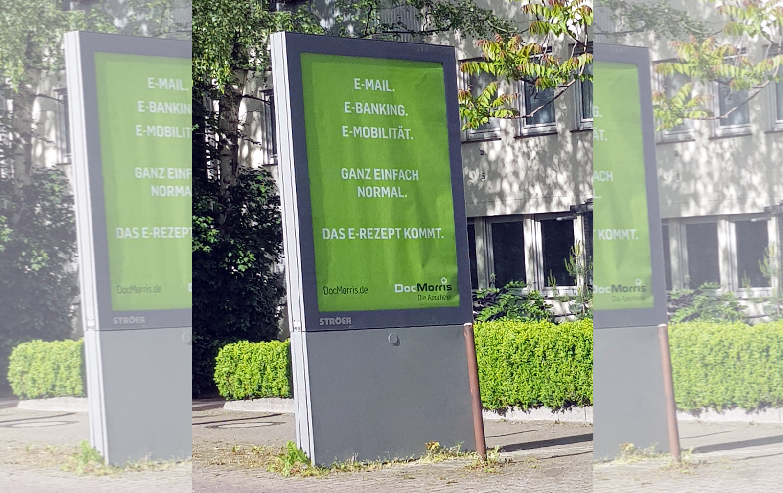 „Warum bin ich heute digitaler als mein Rezept?“, so die Frage auf den großformatigen Postern, die seit gestern an verschiedenen Flächen des Vermarkters Ströer hängen. Fast könnte man meinen, DocMorris hätte die neuerliche Verschiebung aufs Korn genommen und die Frage an Gematik-Chef Dr. Markus Leyck Dieken gerichtet. Doch natürlich sollte es eine Aufforderung an die Verbraucher:innen sein, ihre Rezepte nach Heerlen zu schicken: „Jetzt DocMorris App downloaden und mit dem E-Rezept online Medikamente bestellen“, heißt es auf den Plakaten weiter.