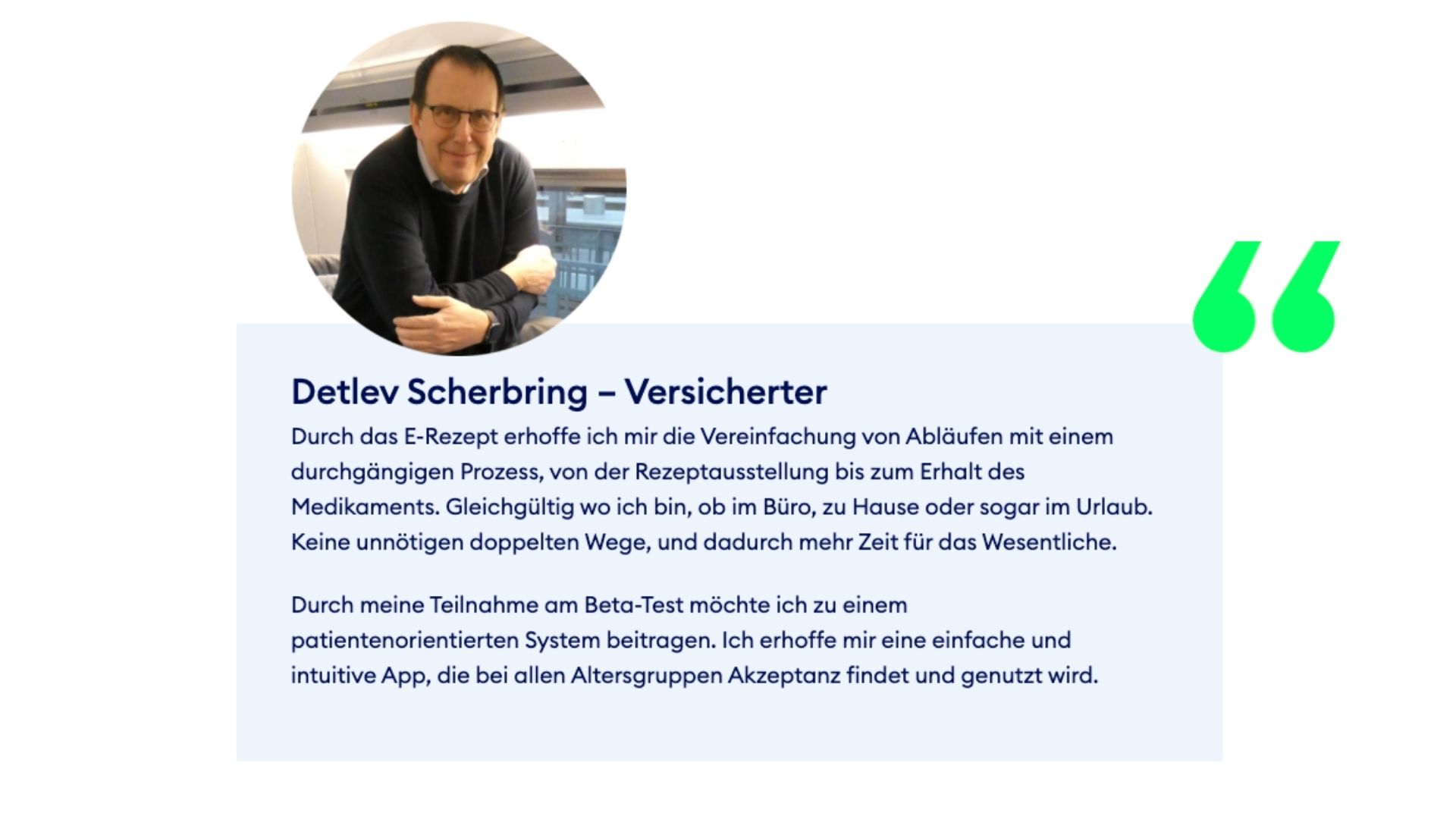 Detlev Scherbring genießt nach eigenen Angaben das Leben – denn er ist Privatier und muss keiner geregelten Arbeit mehr nachgehen. Zeit genug für die Erprobung der E-Rezept-App aus Patientensicht hat er damit auf jeden Fall. „Durch meine Teilnahme am Beta-Test möchte ich zu einem patientenorientierten System beitragen. Ich erhoffe mir eine einfache und intuitive App, die bei allen Altersgruppen Akzeptanz findet und genutzt wird“, zitiert ihn die Gematik als „Versicherten“ auf ihrer Website. Durch das E-Rezept erhoffe er sich eine Vereinfachung von Abläufen mit einem durchgängigen Prozess, von der Rezeptausstellung bis zum Erhalt des Medikaments: „Gleichgültig wo ich bin, ob im Büro, zu Hause oder sogar im Urlaub.“