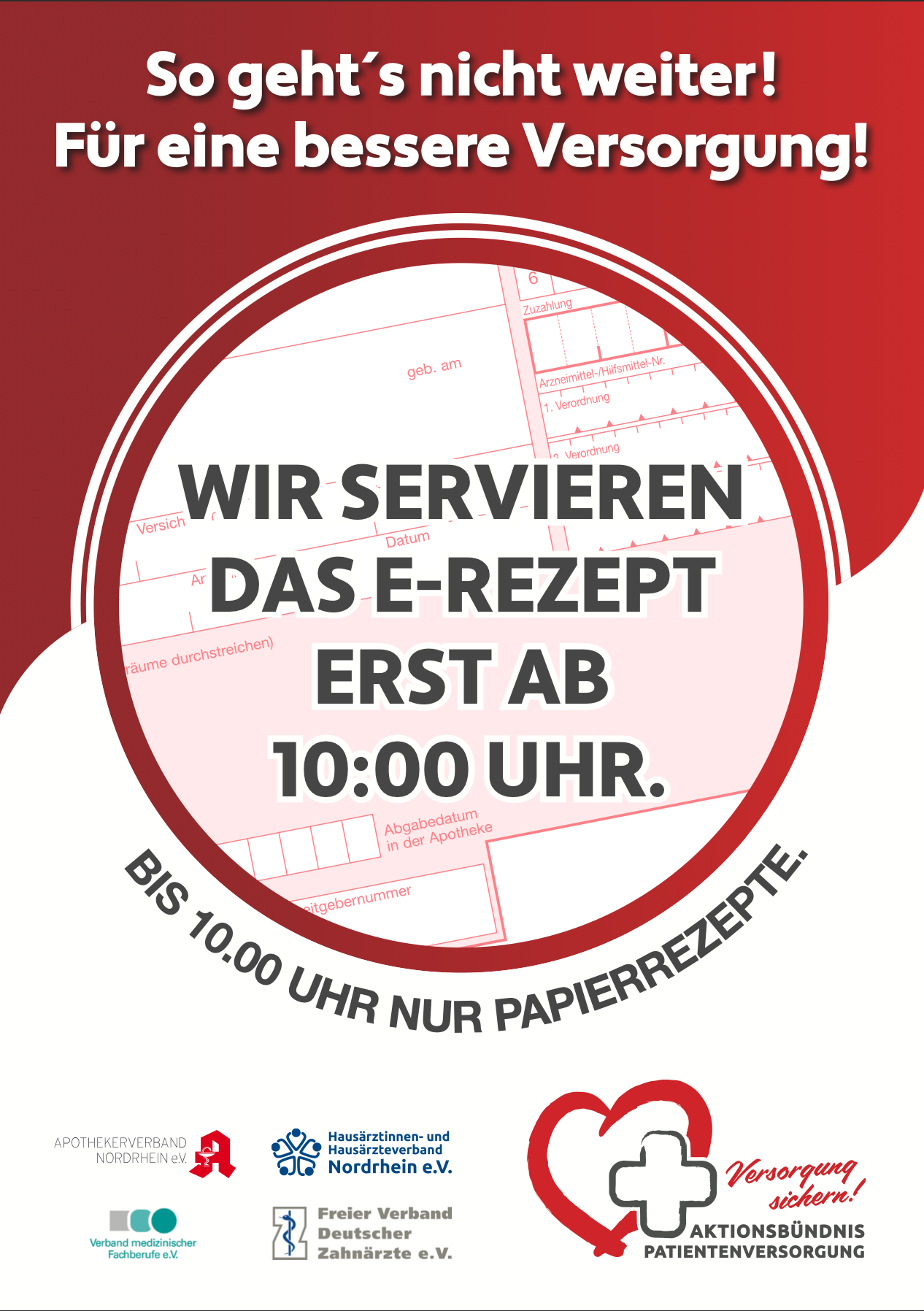 Da in dieser Zeit weder Arztpraxen Rezepte ausstellen können, noch in Apotheken ein Abruf möglich ist, sieht sich das Aktionsbündnis zu diesem Schritt gezwungen. „Jetzt setzen wir im Interesse unserer Patienten in den Morgenstunden bis 10 Uhr auf das bewährte und sichere Papierrezept. Unter dem Motto ‚Für Ihre bessere Versorgung‘ informieren wir Patientinnen und Patienten aktuell darüber.“