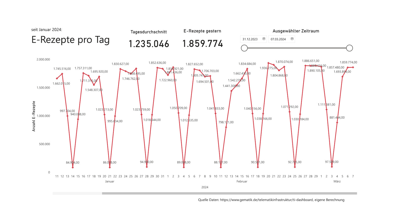 Im Vergleich zur Woche davor war die Zahl der eingelösten E-Rezepte seit Montag durchweg rückläufig: