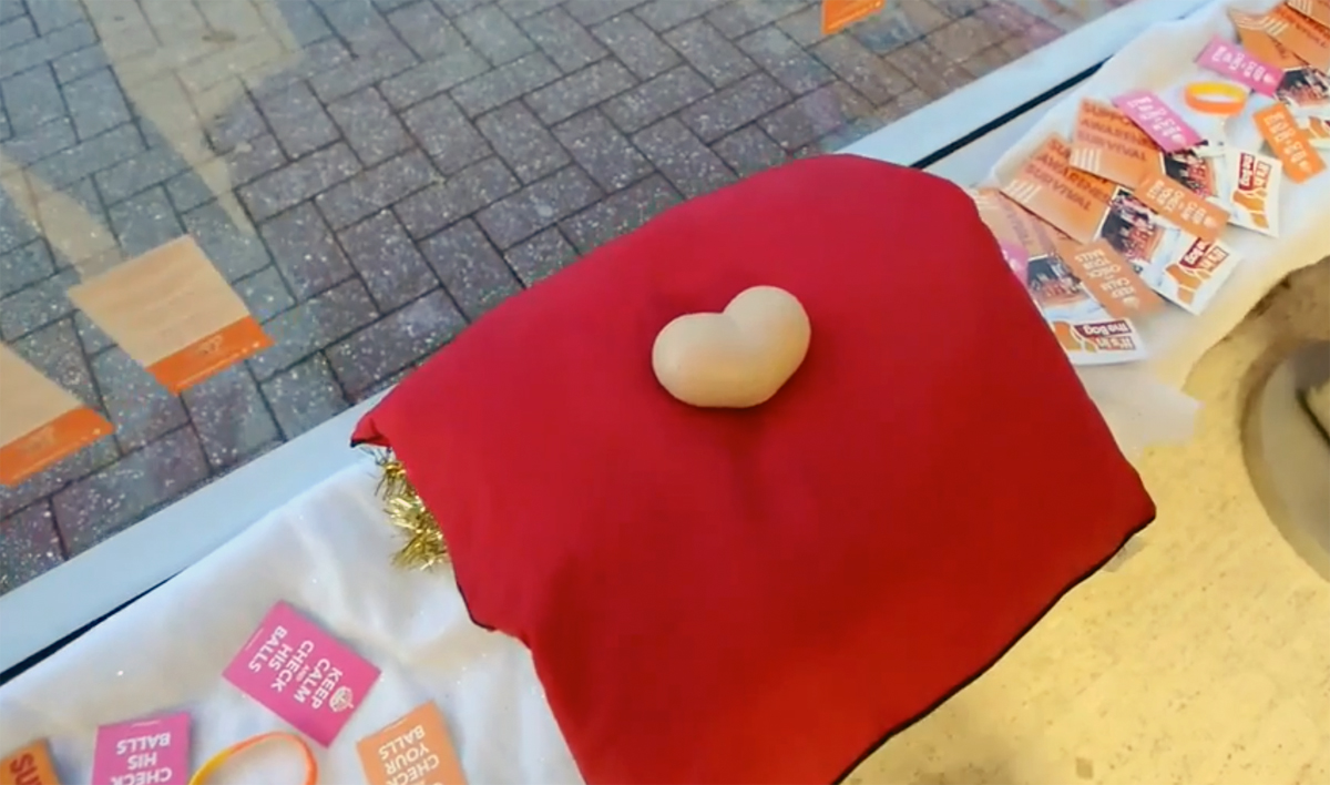 Auf ein rotes Kissen mit goldfarbenen Fransen drapiert ist das täuschend echt anmutende Modell eines Hodens. Ein Zettel darüber richtet sich vor allem an die Männer unter den Apothekenkunden und vorbeigehenden Passanten: „Wie gut gibst du auf deine Kronjuwelen acht?“ Umrahmt wird die Deko mit Flugblättern, die den bekannten Slogan „Keep calm and carry on“ drastisch, aber themengerecht abwandeln: „Keep calm and check your balls“ (entspricht im Deutschen etwa einem „Bewahre die Ruhe und check deine Eier“). Wer mehr wissen will, für den liegen Informationsmaterialien in der Offizin bereit.