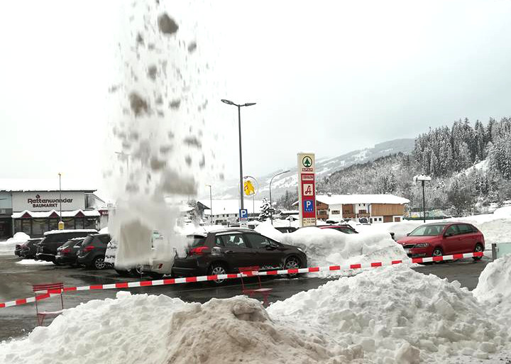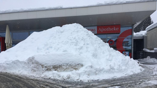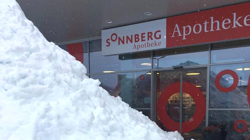 Meterhoch liegt der Schnee in der Alpenregion auf den Hausdächern. Gefährlich wird es, wenn die Last zu schwer wird. Seit Tagen räumen deshalb Helfer zahlreiche vom Einsturz bedrohte Dächer. Auch in der Sonnberg Apotheke in Tirol befreit eine Baufirma derzeit das Flachdach des Gebäudes vom Schnee. Vor der Offizin wächst der Berg.