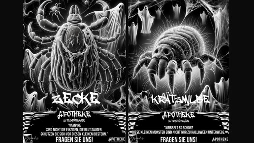 Plakate mit Zeichnungen von Floh, Bettwanze, Kopflaus, Zecke und Krätzmilbe unter dem Mikroskop sollten in Wellans Apotheke U1 Troststraße für Aufmerksamkeit sorgen. Und weil die kleinen Krabbler so schrecklich gruselig sind, waren sie genau passend für die Halloween-Deko.