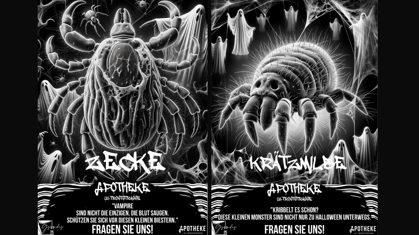 Auch auf Facebook verbreitete er die schwarzen, aber auffälligen Plakate: „Diese kleinen Monster sind nicht nur zu Halloween unterwegs! Suchst Du nach effektiven Lösungen oder präventiven Maßnahmen? Komm zu uns in die Apotheke U1 Troststraße! Wir beraten Dich gerne!“