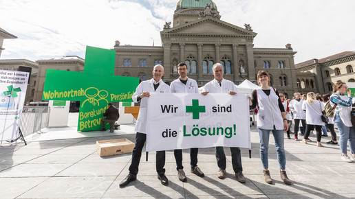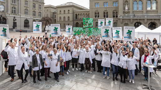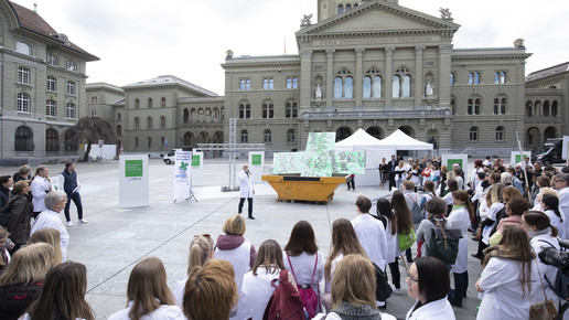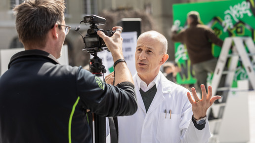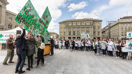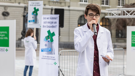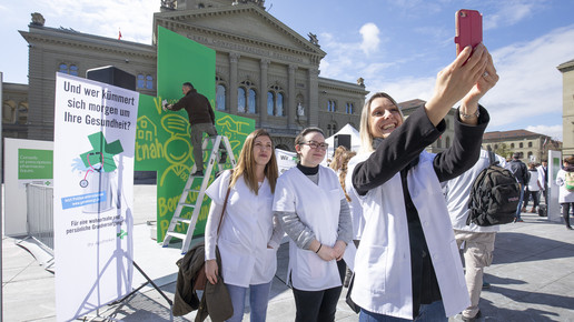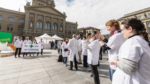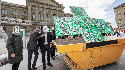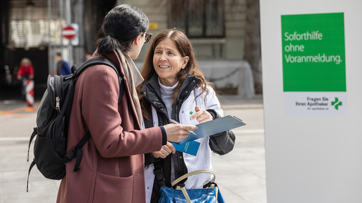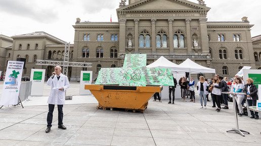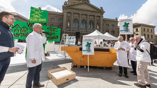 Um sich gegen die Sparpläne der Regierung zu wehren, fährt der Schweizer Apothekerverband seit zwei Monaten eine großangelegte Kampagne: Um zum Start der Petition im April Aufmerksamkeit zu erregen, organisierten sie eine Demonstration in Basel, bei der ein Künstler ein vier Meter hohes, grünes Kreuz – das Pendant zum deutschen Apotheken-A – bemalte und in einem Schuttcontainer versenkte. Vier Wochen später dann hatte der Verband zum „Nationalen Sammeltag“ aufgerufen: Landesweit bedienten Apotheker in Schwarz, um auf ihre Anliegen aufmerksam zu machen. Manche Apotheker beteiligten sich auch mit kreativen Aktionen in Eigenregie, vor einer Baseler Offizin beispielsweise erwartete die Kunden ein Sarg.