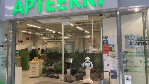 „Besonders Kinder und ältere Menschen mögen ihn“, sagt Apothekerin Eeva Teräsalmi. Aber eigentlich kann ihm niemand widerstehen. Wo der 1,20 Meter große Roboter auftaucht, sorgt er für Aufmerksamkeit. Da können PTA und Apotheker nicht mithalten, die Finnen nehmen es allerdings mit Humor. „Er ist ein Pepper-Roboter, der in Japan entwickelt wurde. In Finnland gibt es rund 15 davon, die in Gesundheitszentren, Bibliotheken und Erziehungseinrichtungen arbeiten.“ Und jetzt auch in der Apotheke.