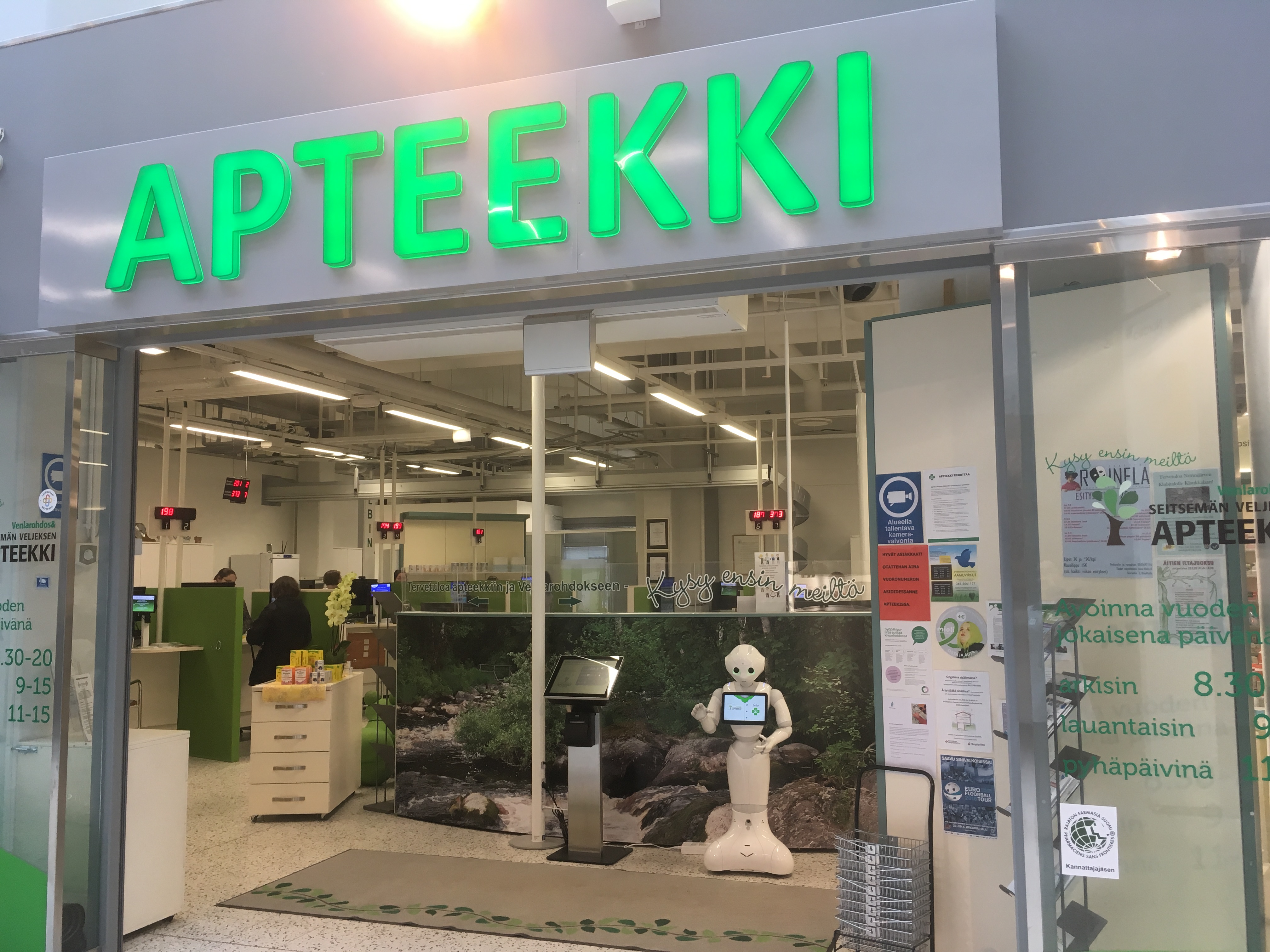 „Besonders Kinder und ältere Menschen mögen ihn“, sagt Apothekerin Eeva Teräsalmi. Aber eigentlich kann ihm niemand widerstehen. Wo der 1,20 Meter große Roboter auftaucht, sorgt er für Aufmerksamkeit. Da können PTA und Apotheker nicht mithalten, die Finnen nehmen es allerdings mit Humor. „Er ist ein Pepper-Roboter, der in Japan entwickelt wurde. In Finnland gibt es rund 15 davon, die in Gesundheitszentren, Bibliotheken und Erziehungseinrichtungen arbeiten.“ Und jetzt auch in der Apotheke.