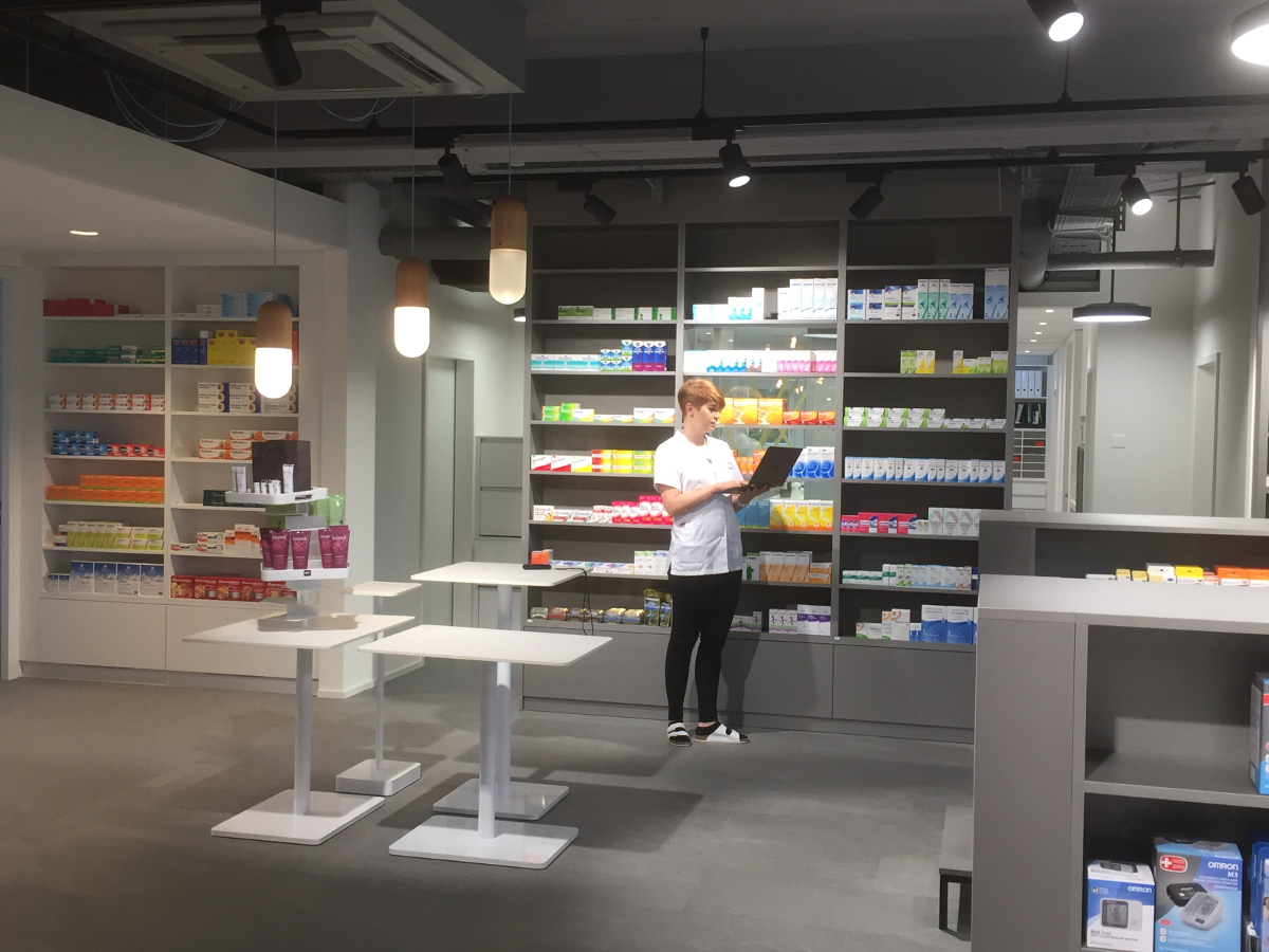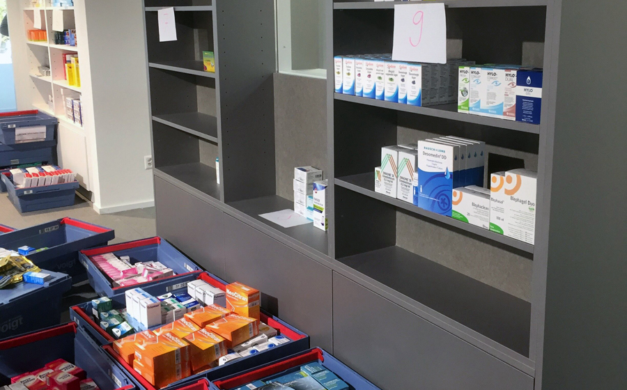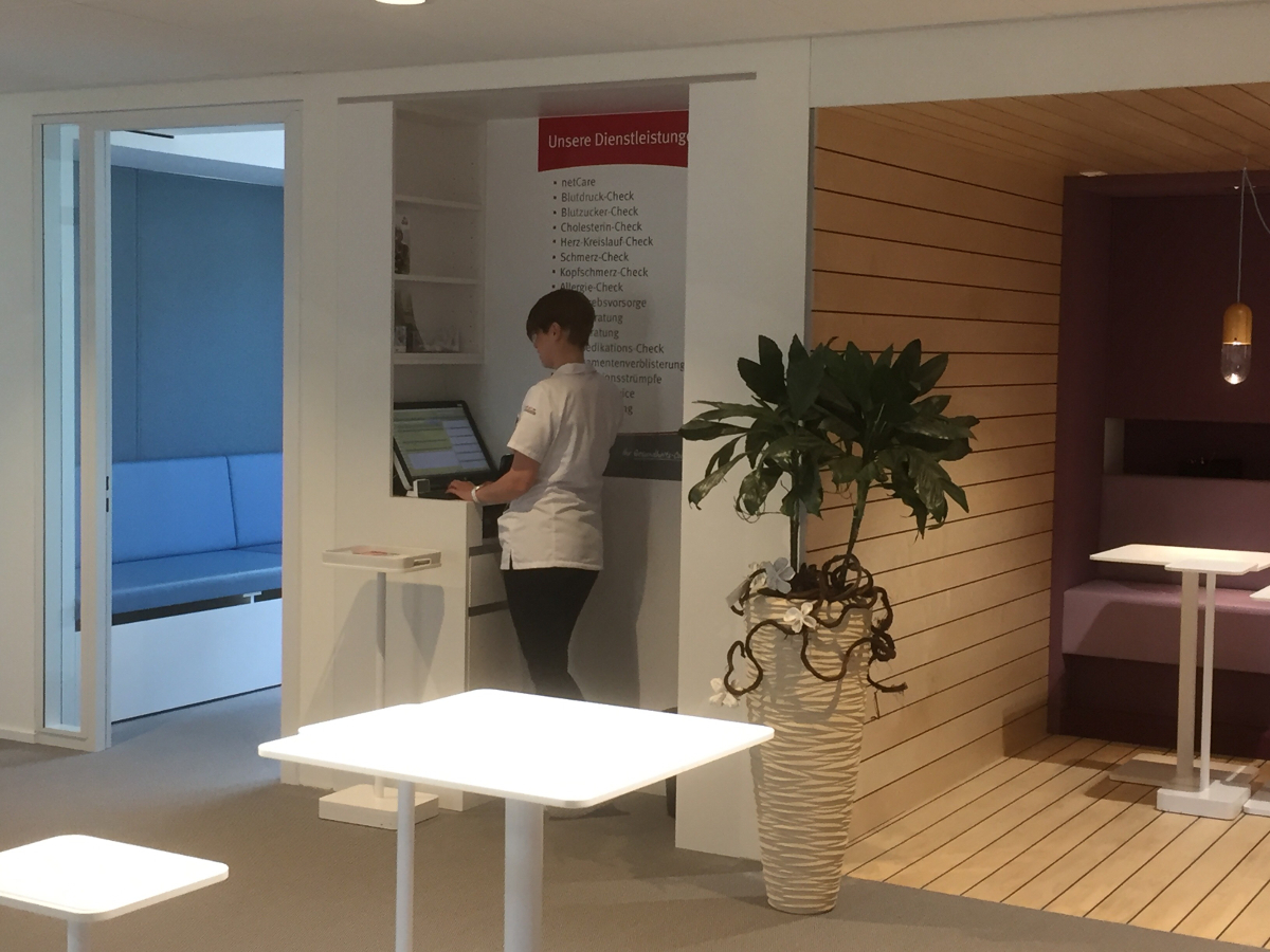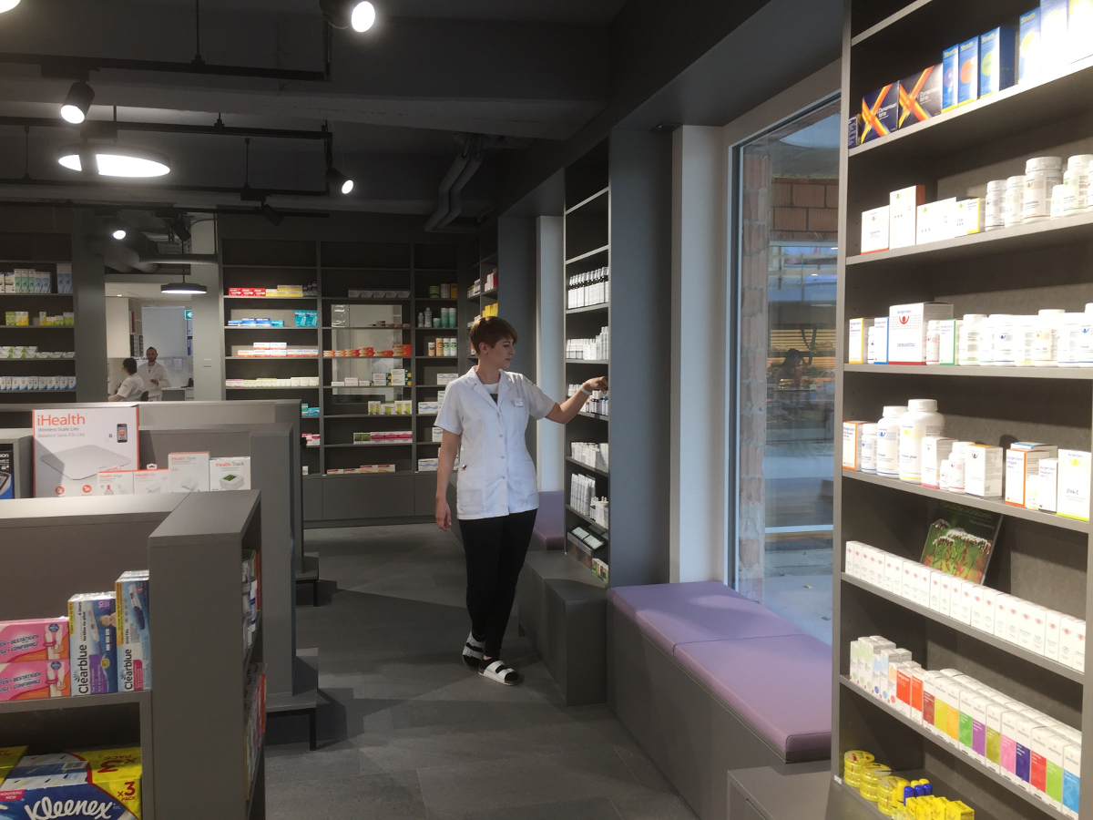 In dem einem finden sich Regale mit zahlreichen Produkten. Die meisten Gespräche und Beratungen finden aber in den Beratungsnischen statt, wo die Mitarbeiter – mit Laptops ausgerüstet – die Medikation mit den Kunden eingehend besprechen können, bevor dann der Kommissionierer in der Mitte des Raumes das gewünschte Arzneimittel ausspuckt. Die Gemütlichkeit kommt an: „Wir hatten schon Patienten, die nach dem Beratungsgespräch sitzen geblieben sind oder nach einem Kaffee gefragt haben“, berichtet Wilders. „Den Zeitdruck, den einige Kunden mitbringen, vergessen viele dann.“ Zudem gibt es abschließbare Beratungsräume, in die sich das pharmazeutische Personal mit den Kunden bei Bedarf zurückziehen können.