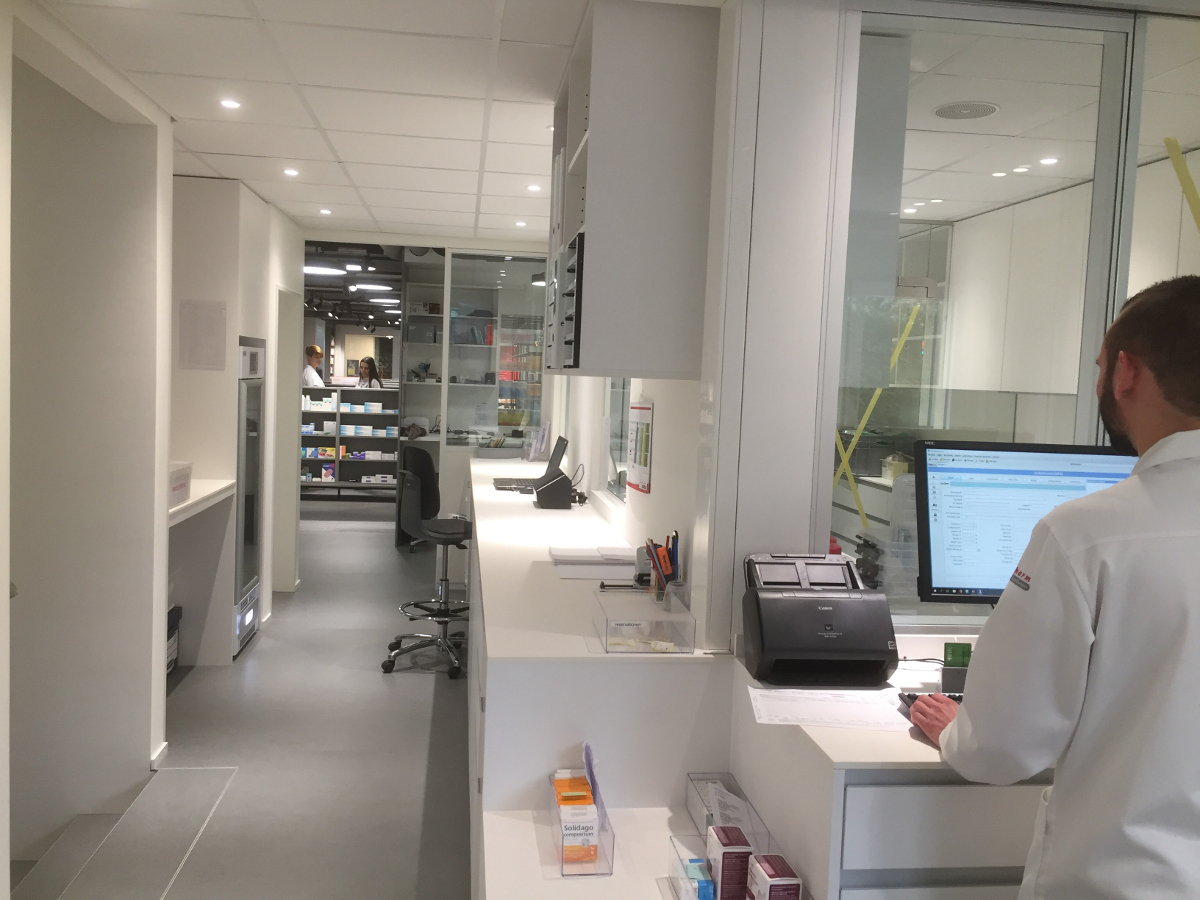 „Unsere Kunden werden etwa in der Mitte des Raumes von einem Mitarbeiter empfangen und begrüßt“, erläutert Monika Wilders, Geschäftsführerin der Erlinsbacher Apotheke. „Ab diesem Moment wird der Kunden begleitet und beraten.“ Die Apothekerin hat 17 Jahre lang in einer klassischen Apotheke gearbeitet und soll in fünf bis zehn Jahren die Erlinsbacher Apotheke übernehmen. Es gibt einen Koordinator, der den Überblick behält und die Patienten an die Kollegen delegiert. Die Kommunikation zwischen den Mitarbeitern erfolgt über Telefone mithilfe einer IT-gestützten Lösung.