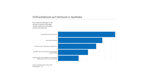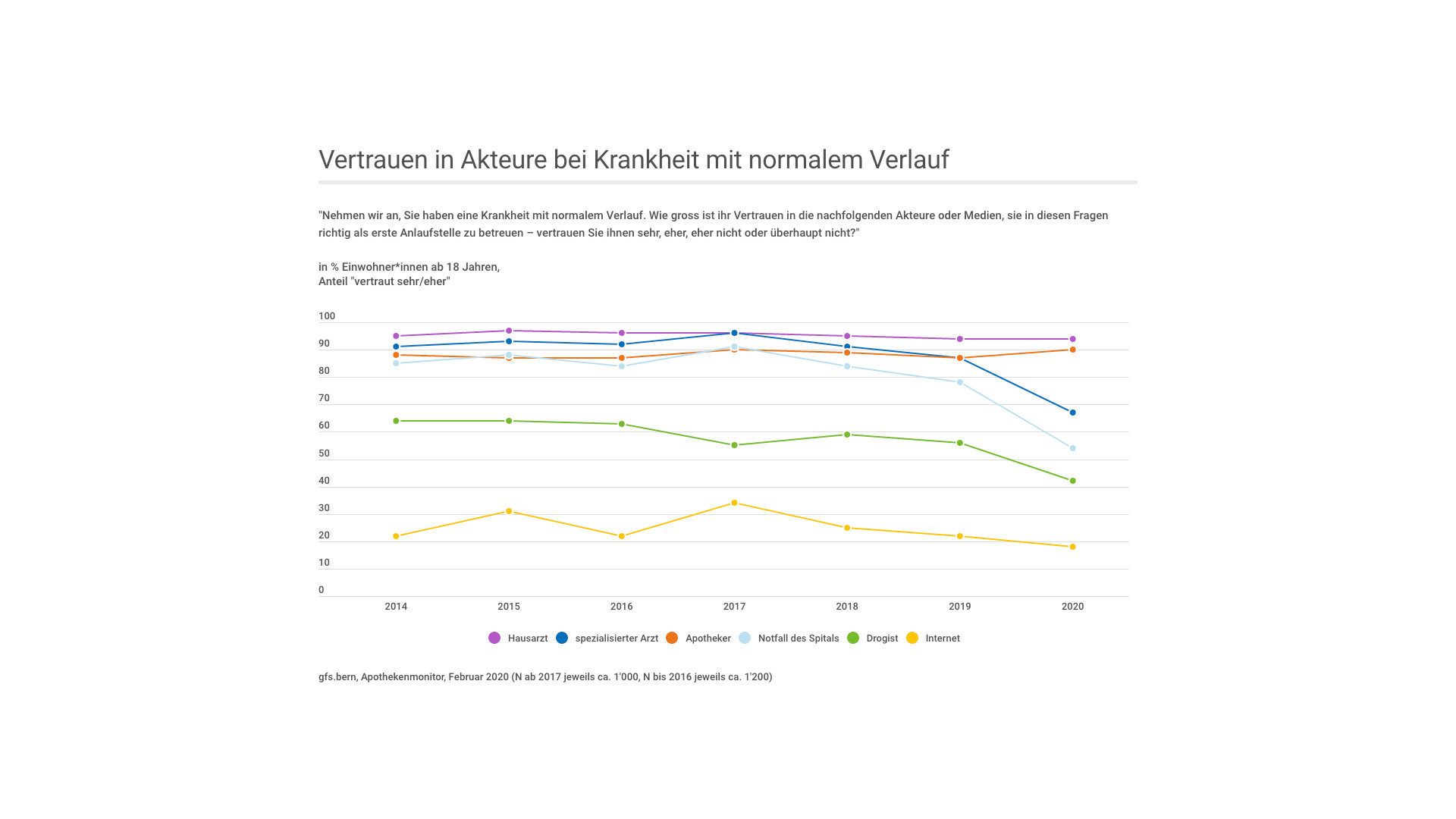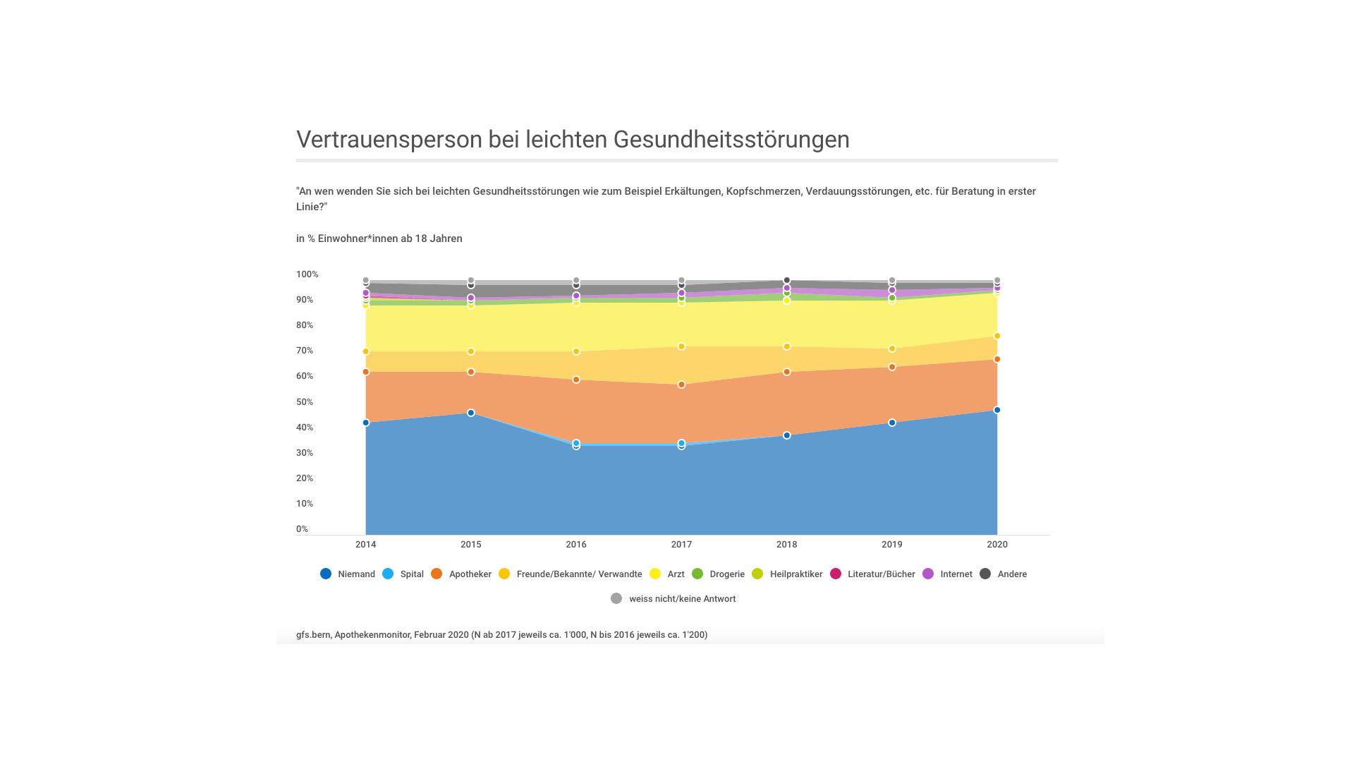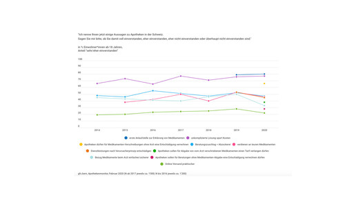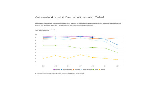 Noch eine Erkenntnis: Das Vertrauen in das Internet für den Bezug von Gesundheitsinformationen und Medikamenten sinkt. Auch in anderen Studien aus dem Gesundheitswesen lässt sich laut Pharmasuisse eine Unsicherheit in der Bevölkerung bezüglich digitaler Angebote feststellen. Bewährte und einfach zugängliche Anlaufstellen wie Apotheken konnten hingegen ihre Stellung als Beratungsstellen festigen. Sie genießen neben der Ärzteschaft am meisten Vertrauen in der Bevölkerung.