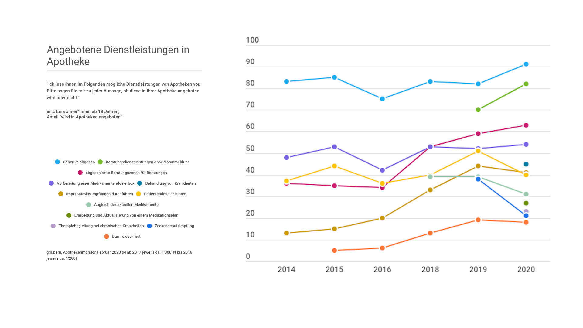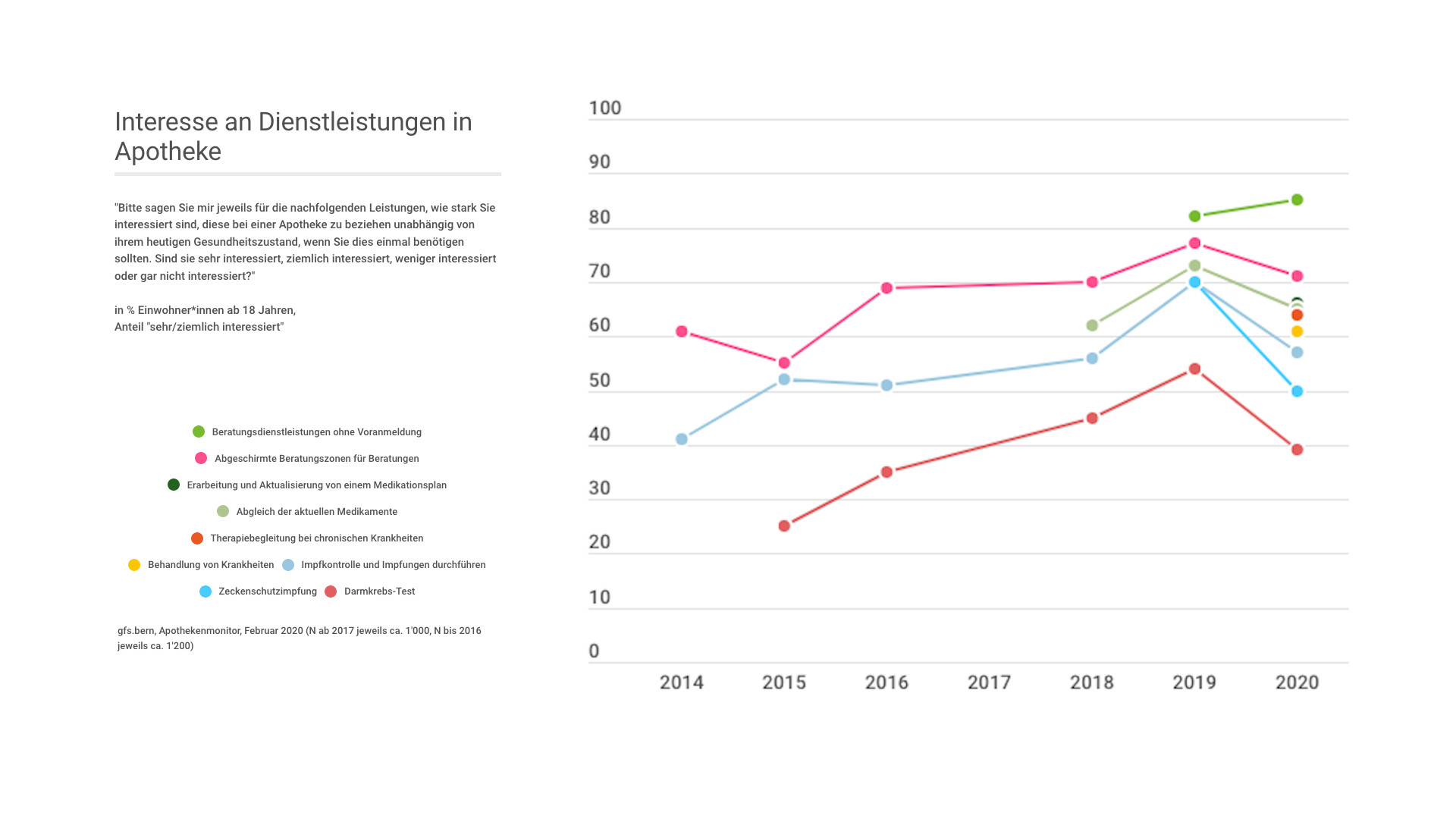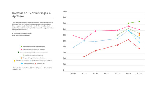 In der Schweiz ist das Interesse der Bevölkerung an Dienstleistungen der Apotheken erstmals gesunken. Um 13 bis 20 Prozentpunkte rückläufig war das Interesse an Impfkontrollen, Impfungen und dem Darmkrebsvorsorge-Test. Das geht aus dem „Apothekenmonitor 2020“ des Forschungsinstituts GFS Bern im Auftrag des Apothekerverbands Pharmasuisse hervor.