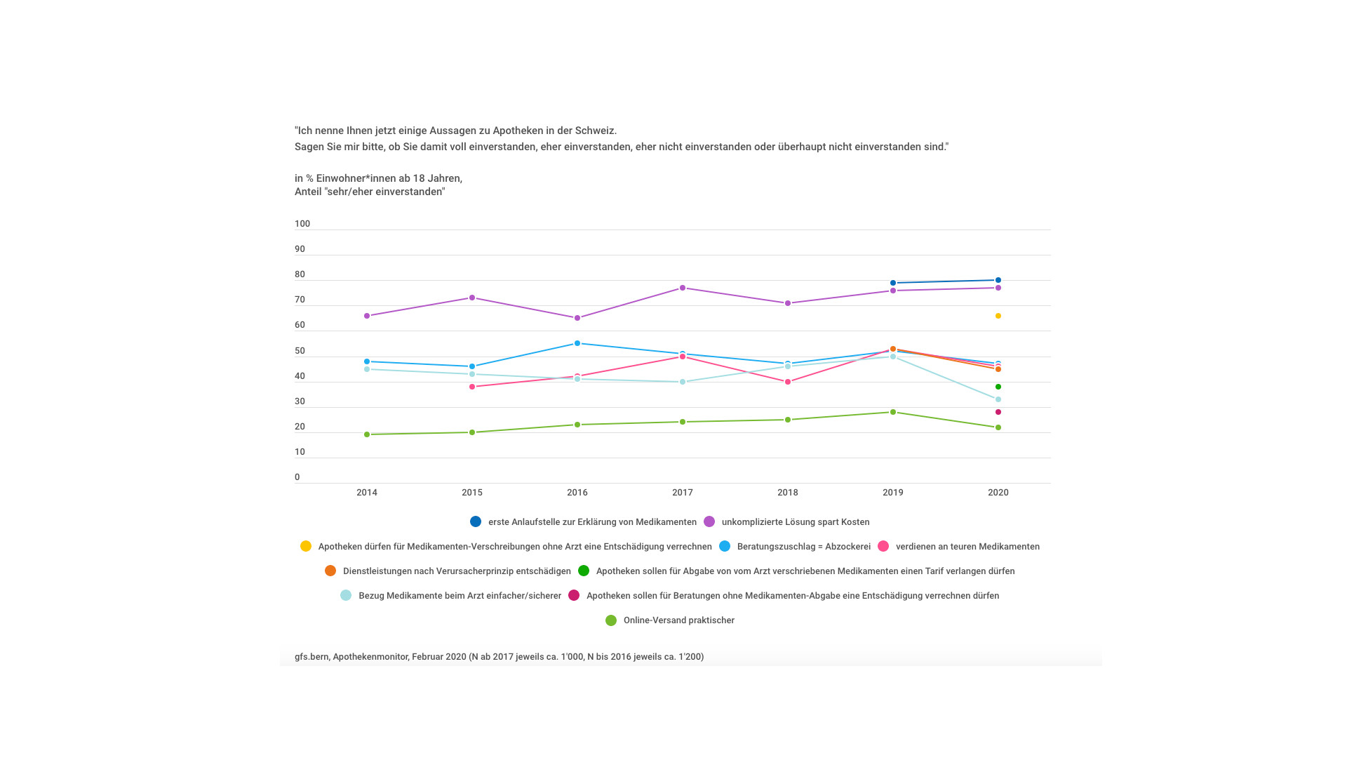 Die Argumente, dass der Beratungszuschlag Abzockerei sei (47 Prozent), Apotheken an teuren Medikamenten verdienen (46 Prozent) und Dienstleistungen nach dem Verursacherprinzip entschädigt werden sollen (45 Prozent), wurden in diesem Jahr nicht mehr mehrheitlich unterstützt. Menschen zwischen 18 und 39 Jahren sehen die Preise der Apotheken eher kritisch.