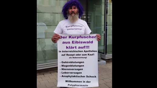 Vor wenigen Tagen stellte er sich – mit einem T-Shirt mit der Aufschrift „Kurpfuscher unterwegs“ gekleidet – provokant vor eine Apotheke in Eibiswald und rollte ein extra angefertigtes Plakat aus: „Der Kurpfuscher aus Eibiswald klärt auf“, stand darauf. Weiter aufgeführt ist eine Auswahl an schlimmsten Nebenwirkungen, die auf Beipackzetteln zu lesen sein können, darunter Gehirn- und Magenblutungen sowie Nierenversagen. Immer wieder soll er Zeitungsberichten nach Kunden der Apotheke gefragt haben, ob sie die Beipackzettel zu den gerade gekauften Medikamenten auch gelesen haben.