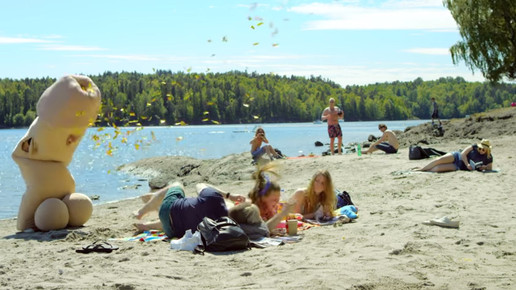 In dem Viralspot schleicht sich der XXL-Phallus an Leute heran, die in Parks, am Strand oder im Café sitzen und verpasst ihnen einen goldenen Konfetti-Regen. Der Schreck ist sichtlich groß bei den Passanten. „Tiss kan overraske. Bruk kondom!“ lautet der Claim: „Ein Penis kann überraschen. Benutze ein Kondom!“