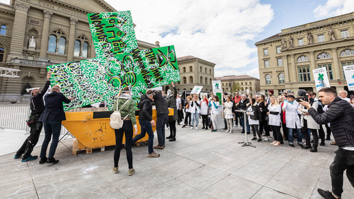 Dafür versucht der Verband Öffentlichkeit zu schaffen: Am 8. April versammelten sich auf dem Berner Bundesplatz 200 Apotheker, um zu protestieren. Die Demo sollte ein Blickfang werden, ein Großteil der Teilnehmer erschien in weißen Kitteln und ein eigens engagierter Künstler wollte mit einem vier mal vier Meter großen grünen Kreuz – das Schweizer Pendant zum Apotheken-A – Aufsehen erregen. Er besprühte es mit Begriffen, mit denen sich die Apotheker brüsten: „wohnortnah“, „persönlich“, „Beratung und Betreuung“ sowie „Hilfe ohne Voranmeldung“. Danach wurde es unter Pfiffen und Buhrufen von mehreren Maskierten in einem Müllcontainer entsorgt – eine Metapher für die Gesundheitspolitik der Regierung.