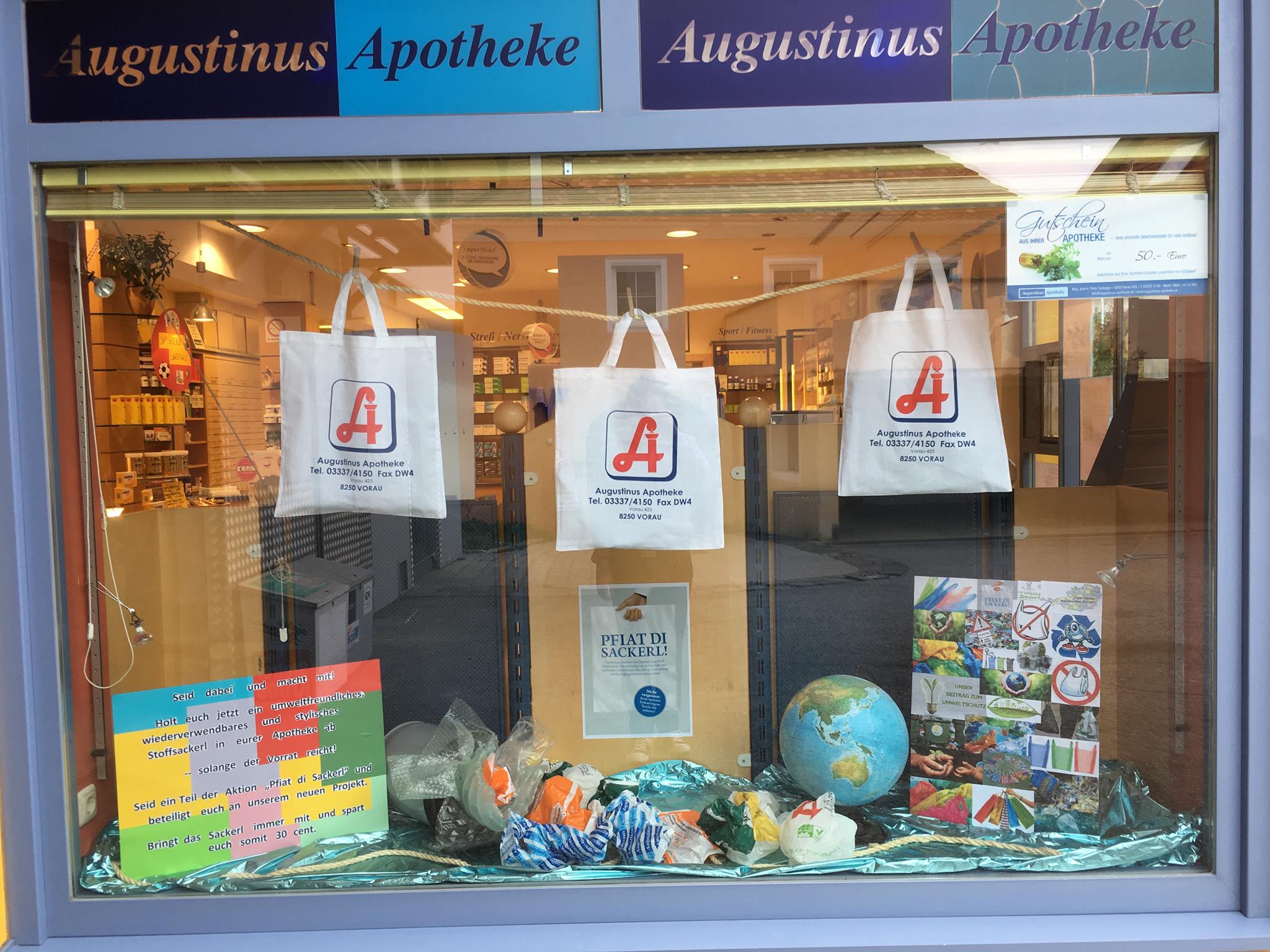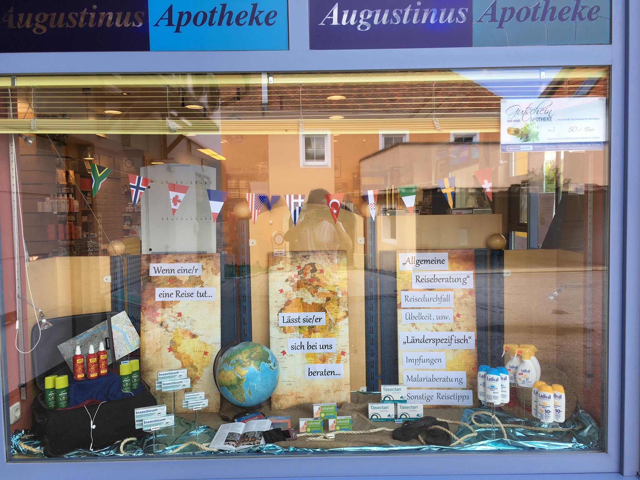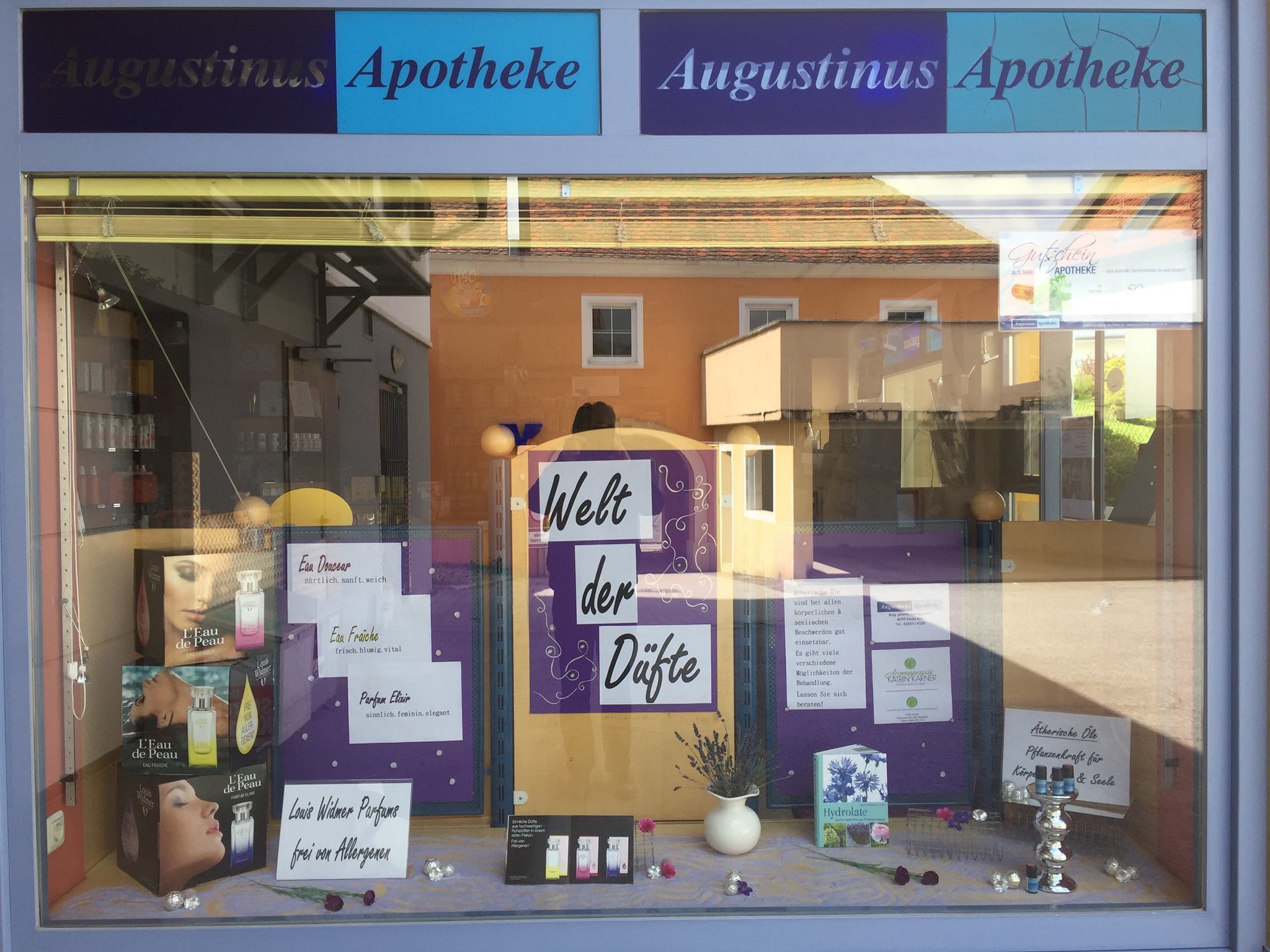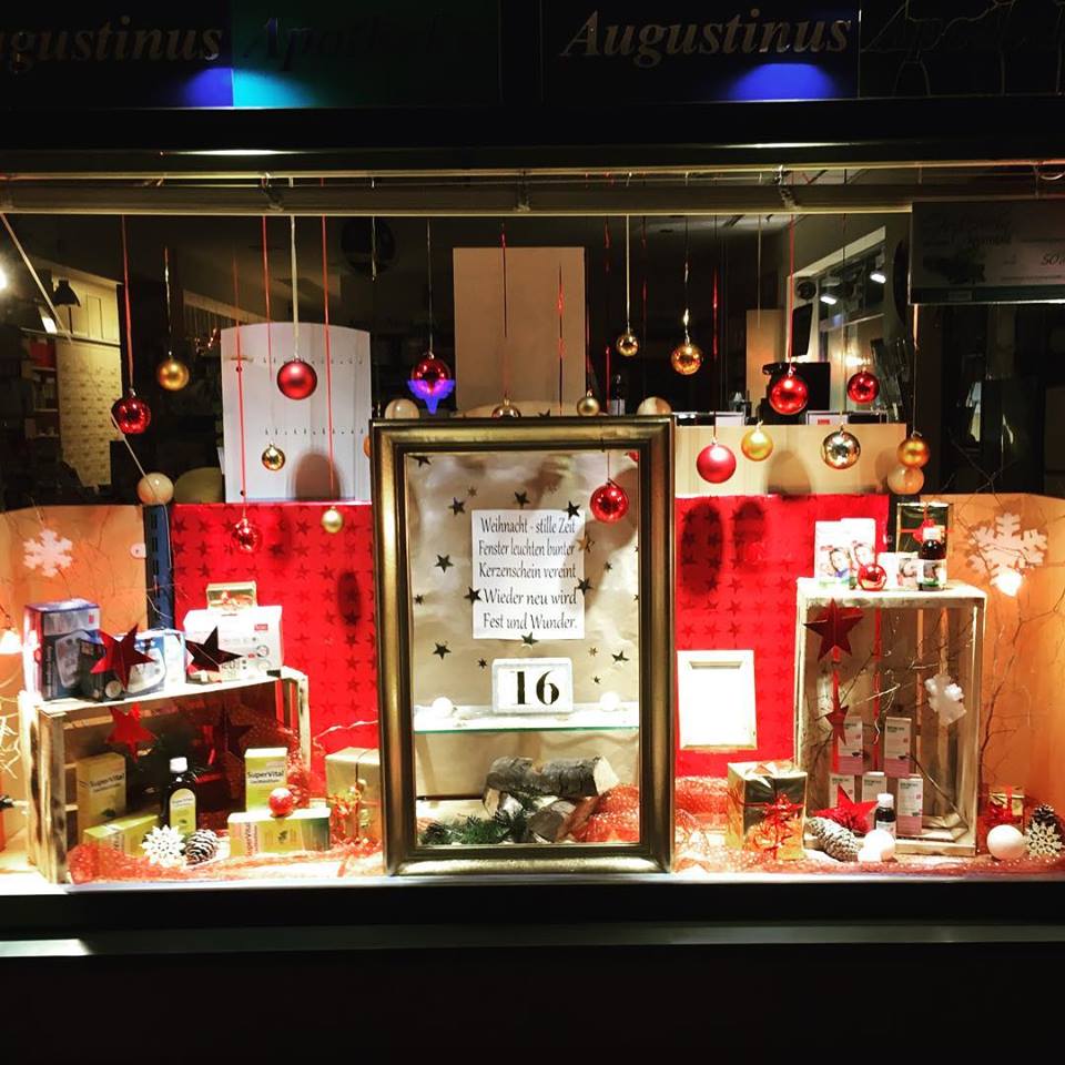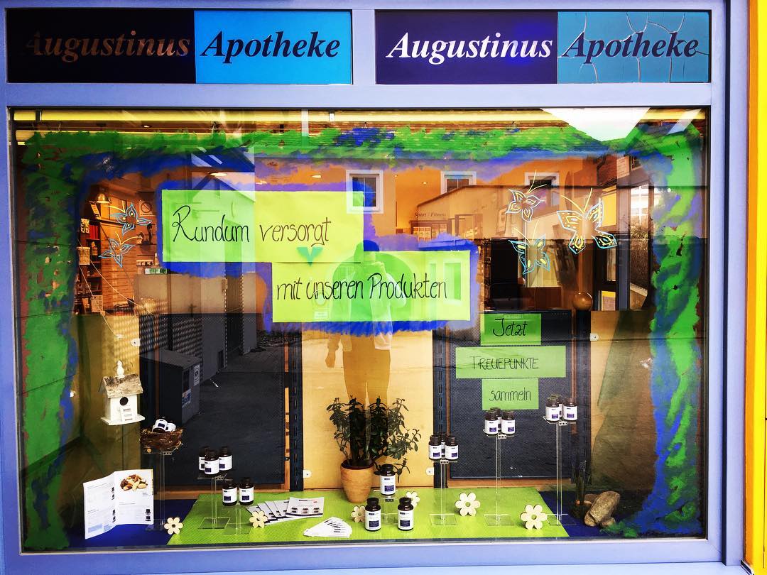 Alle sechs Wochen wird das Schaufenster in der Augustinus Apotheke neugestaltet. „Wir suchen immer nach Dekorationen abseits der klassischen Werbung“, sagt Sallegger. Die Gestaltung übernehmen die Mitarbeiter im Wechsel. Im Schaufenster wurde bereits auf Teemischungen, Eigenmarken, Tipps bei einer Erkältung oder die Grippeimpfung hingewiesen.