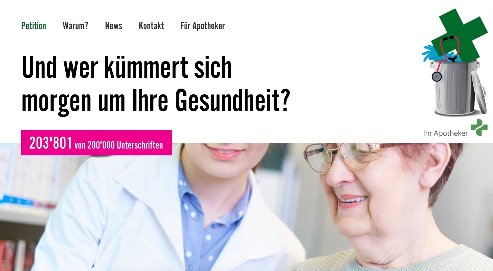 „Klares Signal: Die Bevölkerung sagt Ja zu einer starken Grundversorgung“, triumphiert Pharmasuisse. Die Mühen haben sich vorerst gelohnt. Denn die eidgenössischen Pharmazeuten haben sich in den vergangenen zwei Monaten ordentlich ins Zeug gelegt: Um zum Auftakt auf ihre Petition aufmerksam zu machen, versammelten sich Anfang April rund 200 Apotheker einheitlich in weißen Kitteln auf dem Berner Bundesplatz. Um die Aufmerksamkeit zu erregen, hatte Pharmasuisse einen Künstler engagiert, der ein vier mal vier Meter großes grünes Kreuz – das Schweizer Pendant zum deutschen Apotheken-A – bemalte und anschließend in einem Bauschuttcontainer entsorgte.