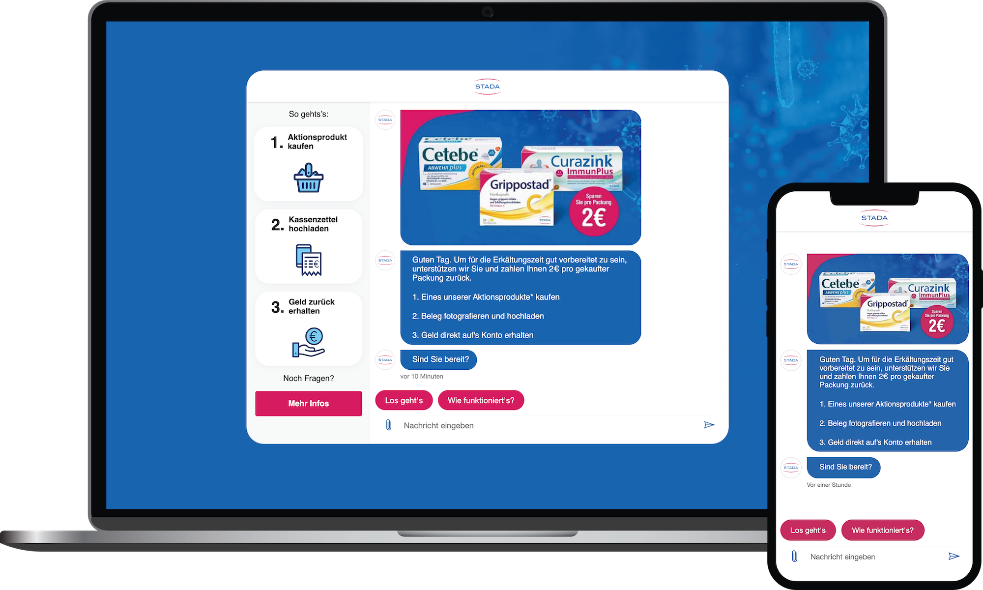 Mehrere Monate soll die Kampagne dauern und neben Flyern am HV insbesondere auf der Anwendung „Cashback per Chatbot“ von Marktguru basieren: Ein für die Aktion kundenindividuell an das Stada-Markendesign angepasster Chatbot soll den Kunden einfach und schnell durch den Cashback-Prozess begleiten. Die Kunden müssen vorher keine App herunterladen. Nachdem sie eines der Aktionsprodukte gekauft haben, scannen sie den QR-Code auf dem Flyer ein und laden in der App über die dahinterliegende Landingpage den Kassenbon hoch. Anschließend bekommen sie den Wert per Cashback auf ihr hinterlegtes Konto erstattet. Pro Packung spendiert der Hersteller einen Betrag von zwei Euro.