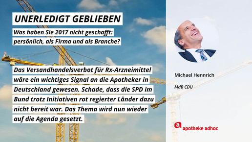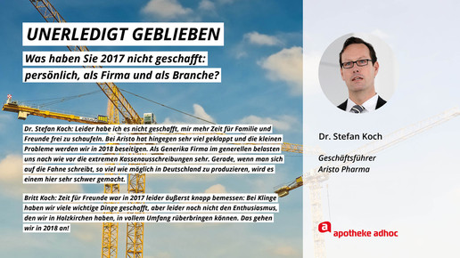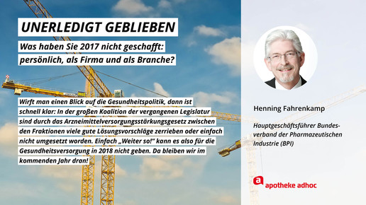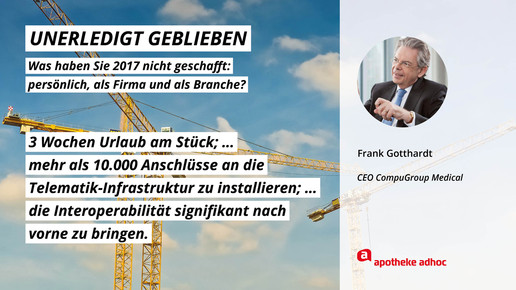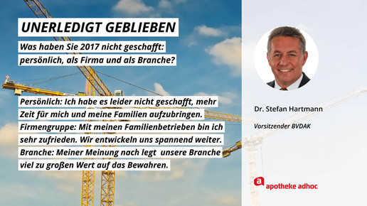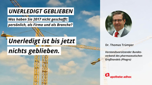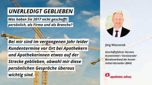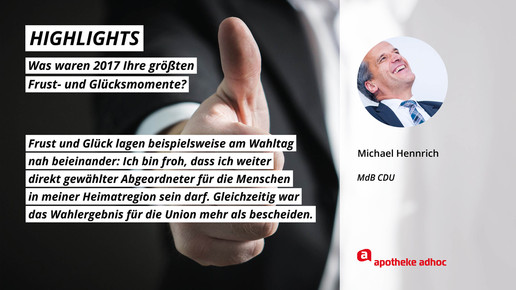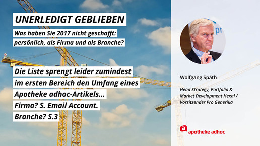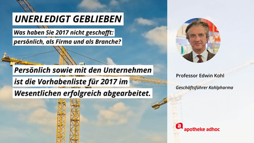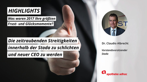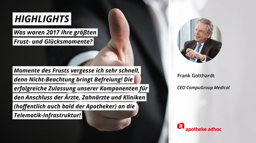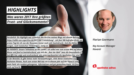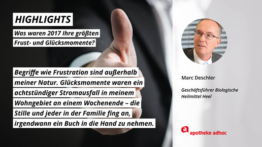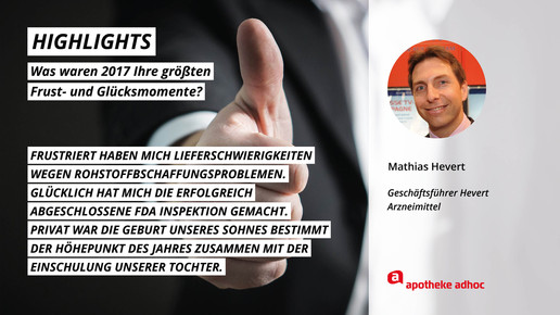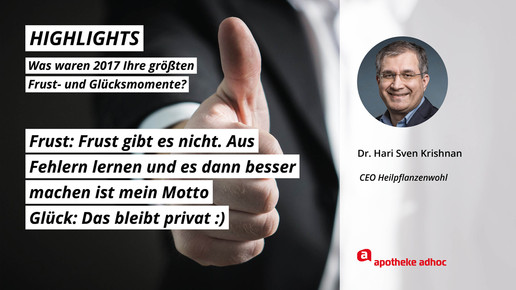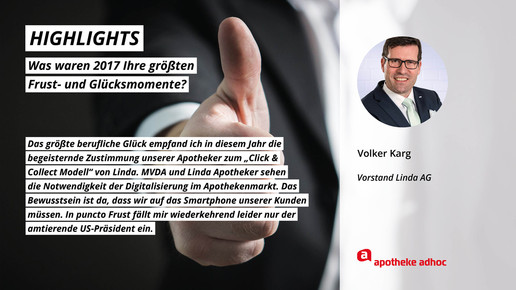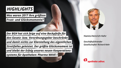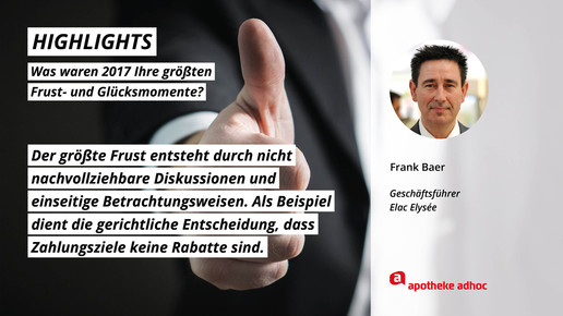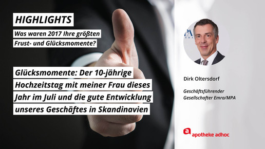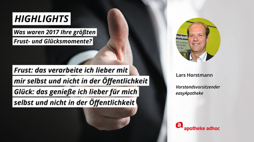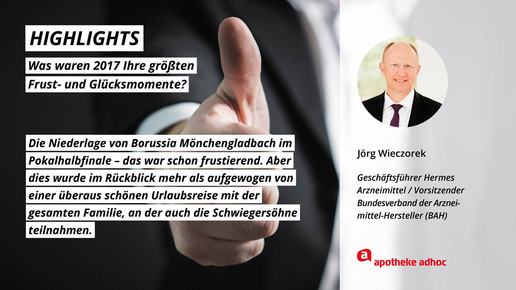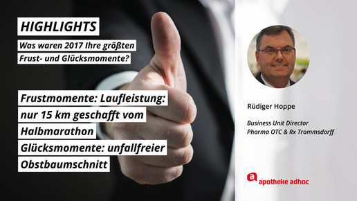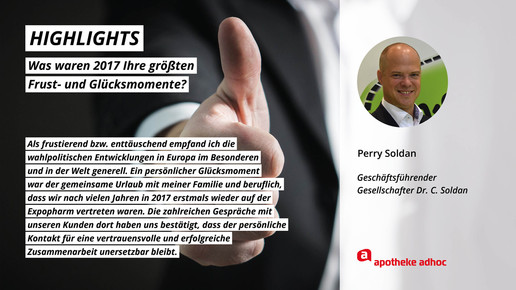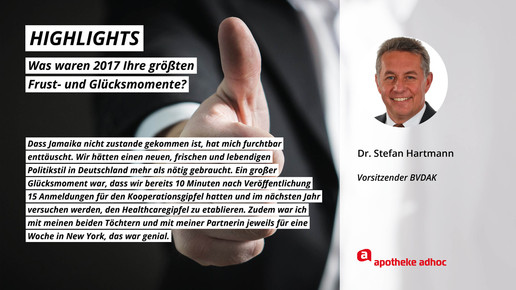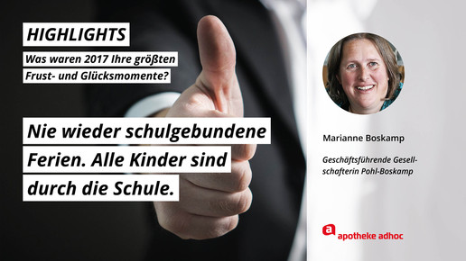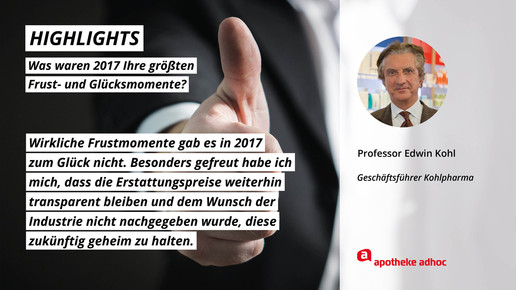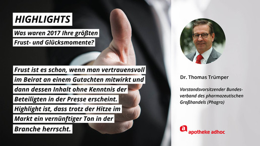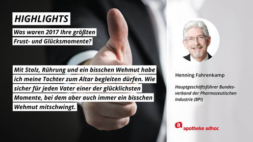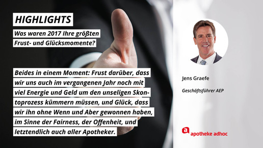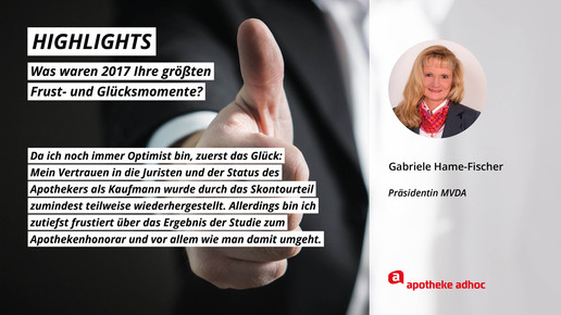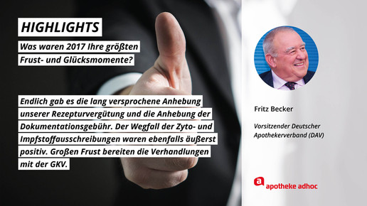 2017 neigt sich dem Ende, Rx-Versandverbot, Skontoprozess und Honorargutachten sorgten für Schlagzeilen. Was den Apotheken- und Pharmamarkt sonst noch bewegt hat, was die größten Glücks- und Frustmomente waren und was unerledigt geblieben ist, verraten prominente Branchenvertreter für den Jahresrückblick von APOTHEKE ADHOC.