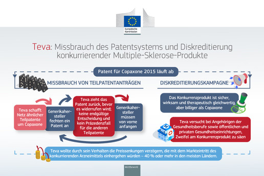 Teva habe in Belgien, Deutschland, Italien, den Niederlanden, Polen, Spanien und Tschechien seine marktbeherrschende Stellung missbraucht, um Copaxone zur Behandlung von Multipler Sklerose (MS) länger vor Wettbewerb zu schützen. Der Konzern habe den Patentschutz künstlich verlängert und systematisch irreführende Informationen über ein Konkurrenzprodukt verbreitet, um dessen Markteintritt und Marktakzeptanz zu behindern, so die EU-Kommission.